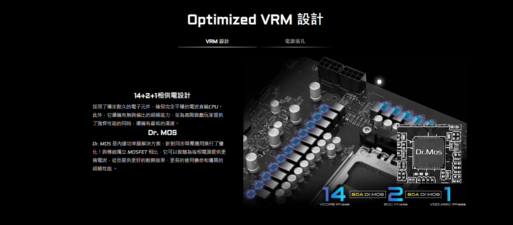 ● 14+2+1 電源相位設計, VCore+SOC+MISC 80A Dr.MOS