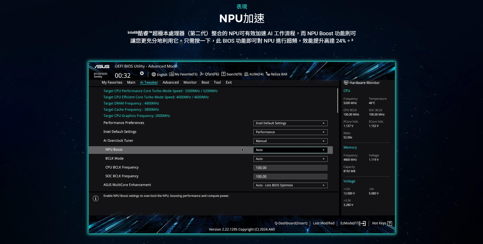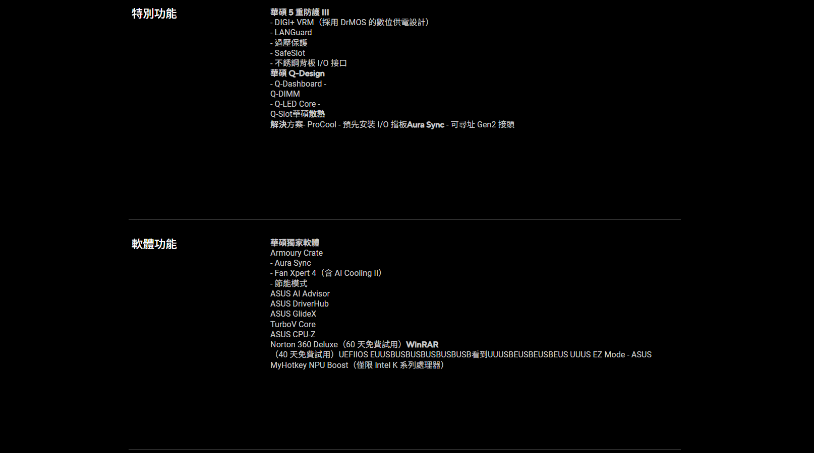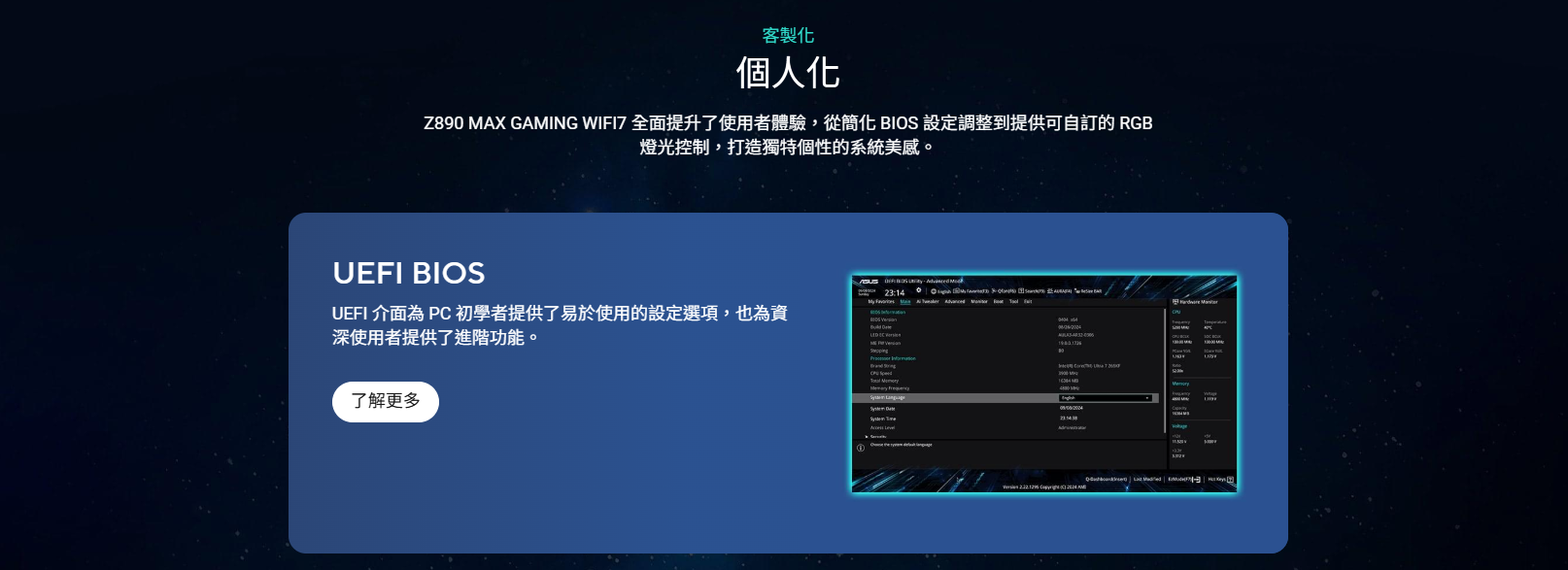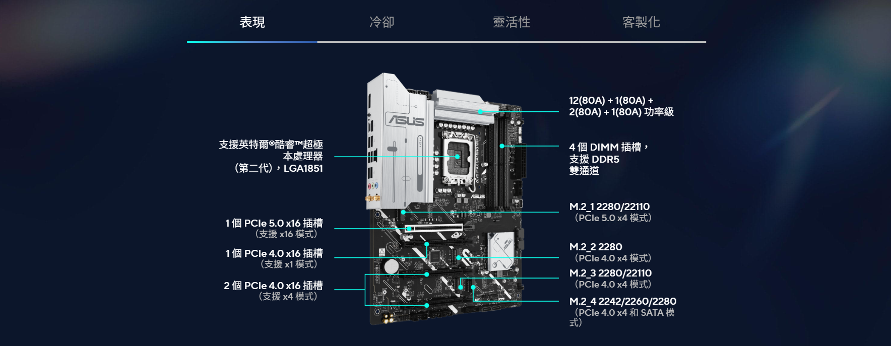 ✦ 適用 PCle 5.0 / DDR5 / WiFi7 / LGA1851 / ATX / intel主機板✦ ASUS AI Advisor 使用戶能夠以簡單直接的方式探索 ASUS 主機板的功能和進階特性✦ 根據 CPU 溫度動態調節風扇轉速,優化散熱並降低雜訊