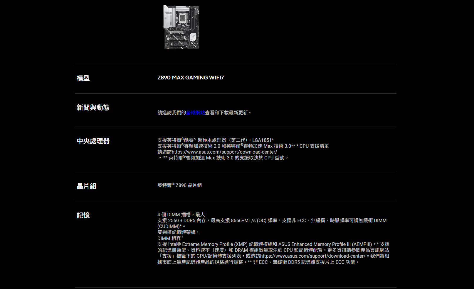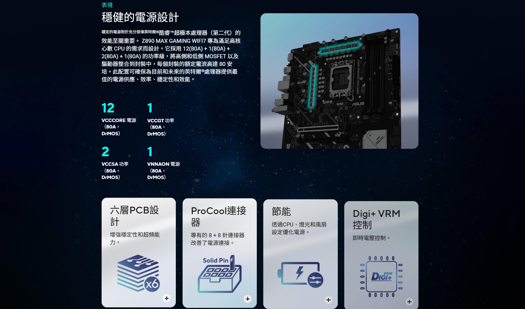 華碩 Z890 MAX GAMING WIFI7(ATX/LAN2.5Gb+Wi-Fi 7/註冊四年)12+1+2+1相電源