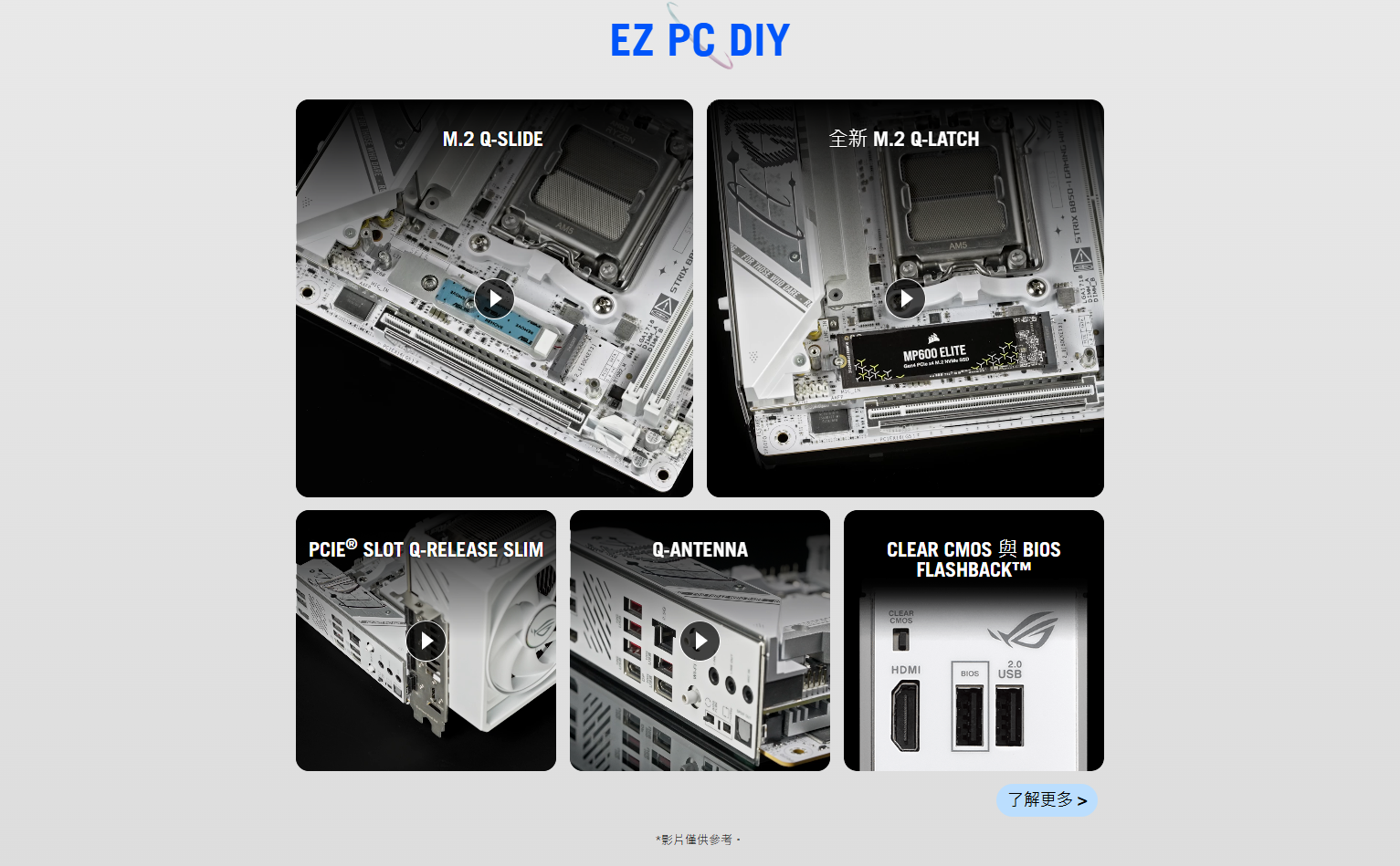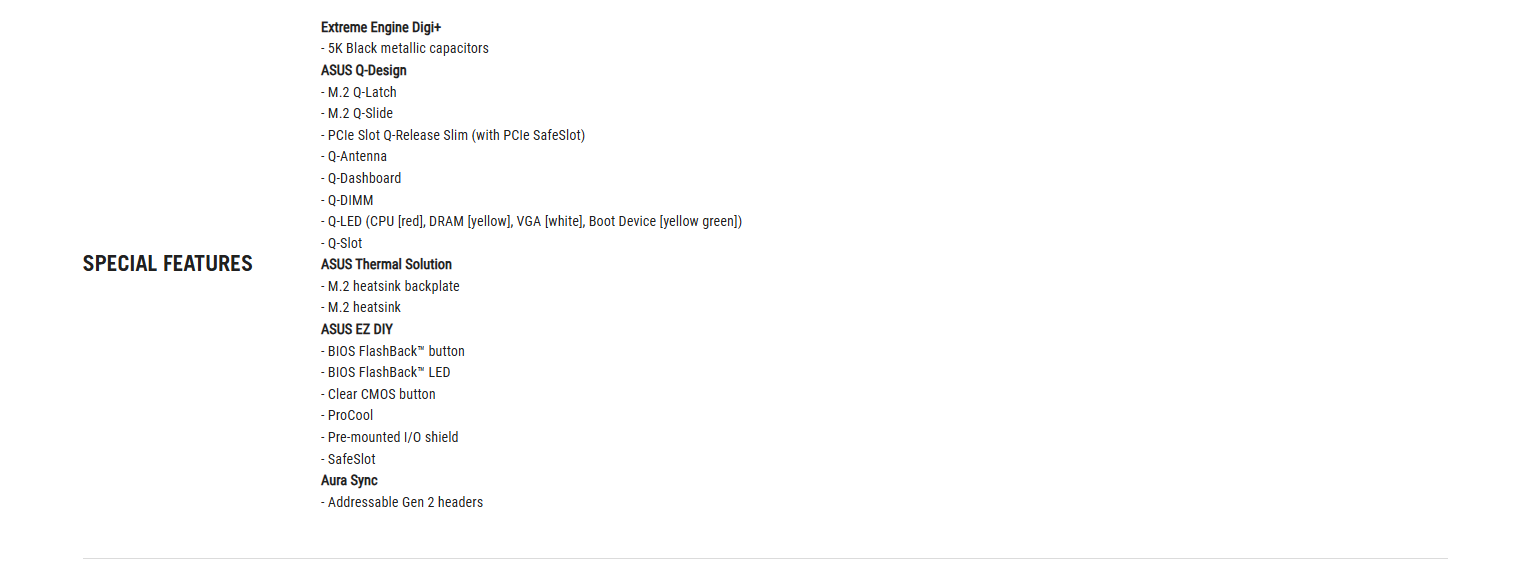 ✦ DIY 友善設計:PCIe Slot Q-Release Slim、M.2 Q-Slide、M.2 Q-Latch、Q-Antenna、Q-Dashboard、Q-LED、BIOS FlashBack™ 按鈕、Clear CMOS 按鈕、FlexKey 按鈕和預先安裝的 I/O 面板