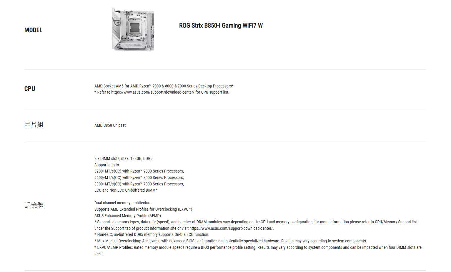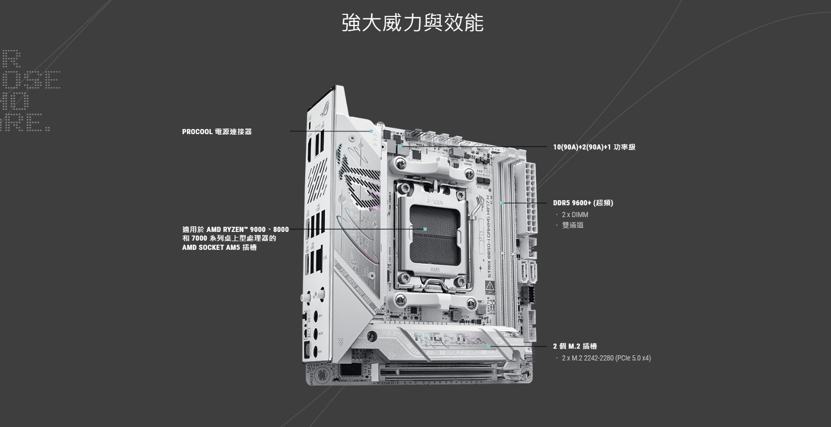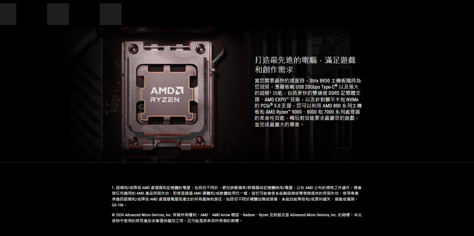 ✦ AMD AM5 插槽:支援 AMD Ryzen™ 9000、8000 和 7000 系列桌上型處理器