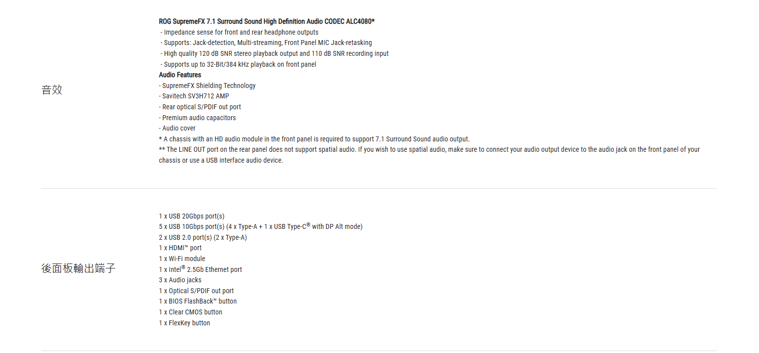 ✦ 身歷其境的音效:ROG SupremeFX ALC4080 編解碼器搭配 Savitech SV3H712 放大器,以及 Dolby Atmos®。