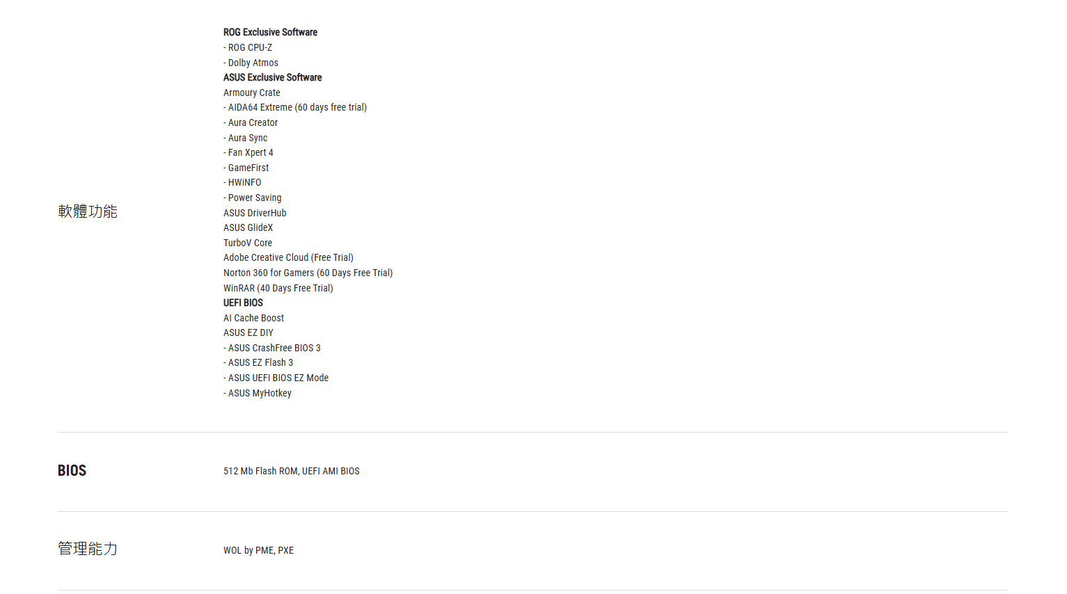 ✦ 享譽盛名的軟體:ASUS DriverHub、TurboV Core、ASUS GlideX、HWiNFO、Norton 360 for Gamers(60 天免費試用)、隨附的 60 天 AIDA64 Extreme 試用版訂閱和直觀的 UEFI BIOS 儀表板。