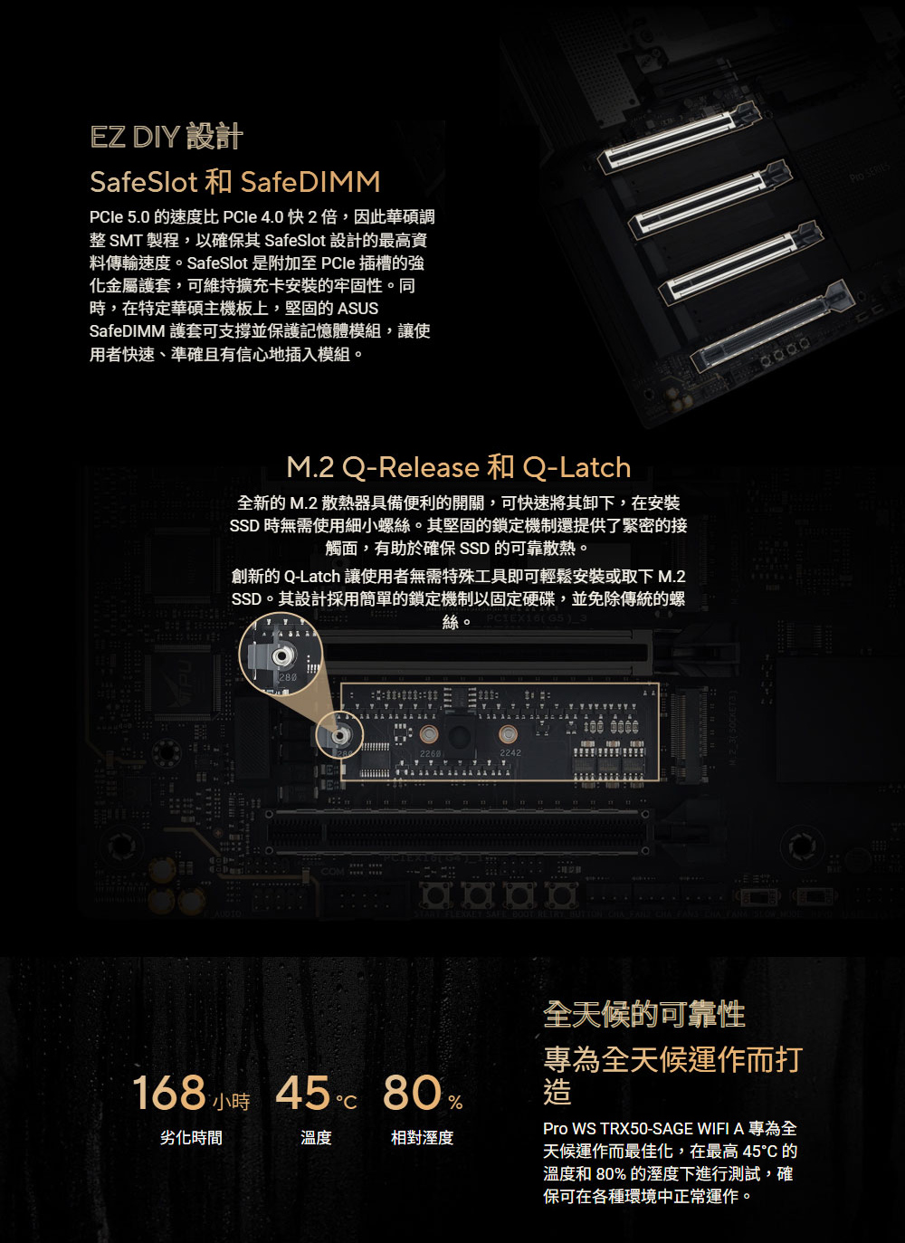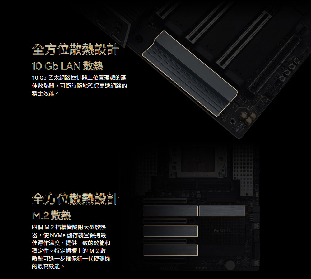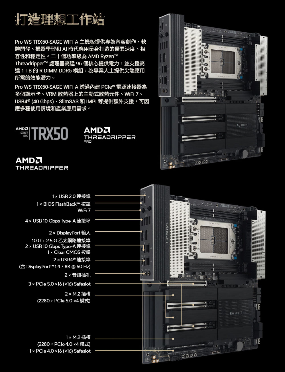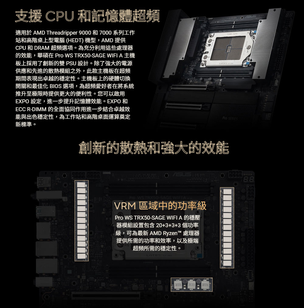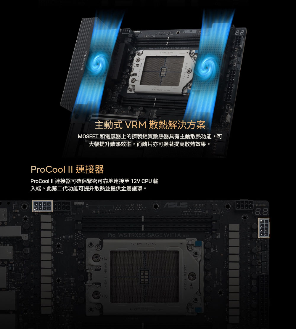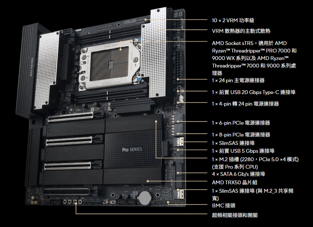✦ AMD sTR5 插槽最高支援 96 核心 CPU:支援 AMD Socket sTR5,適用於 Ryzen™ Threadripper™ PRO 9000 和 7000 WX 系列處理器以及 Ryzen™ Threadripper™ 9000 和 7000 系列處理器