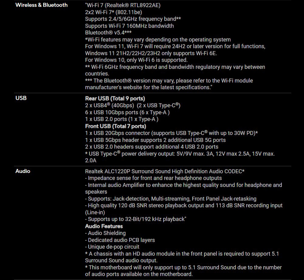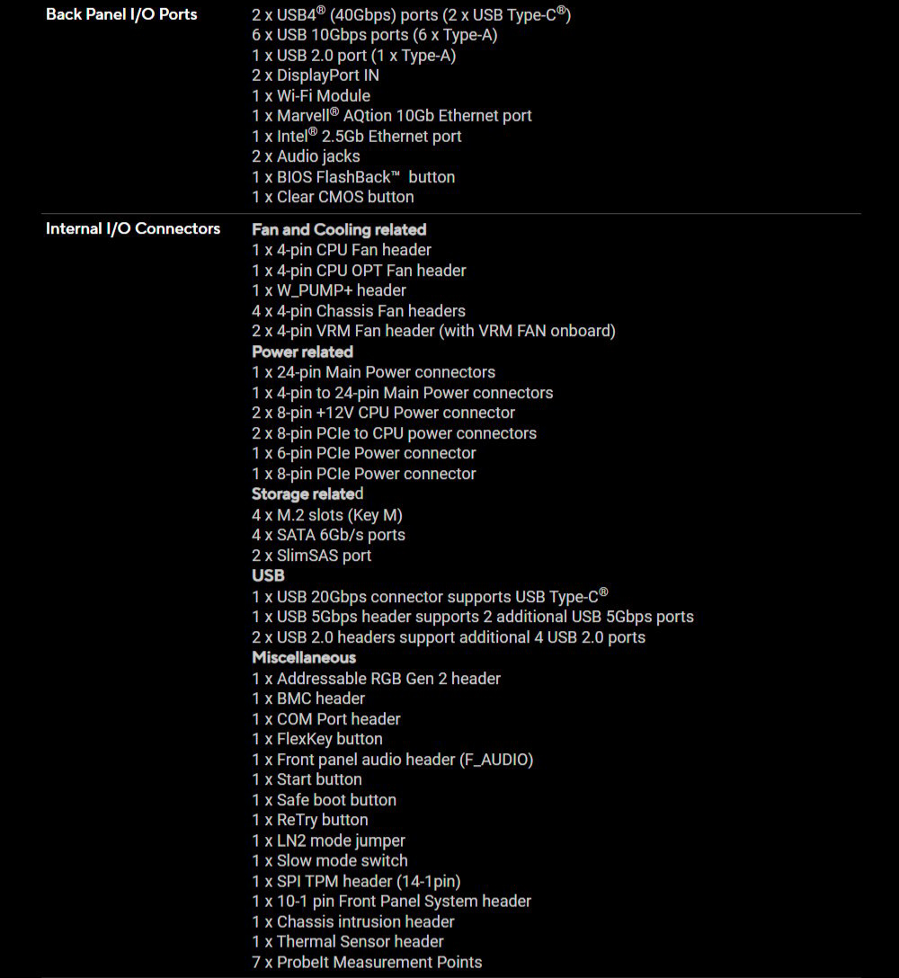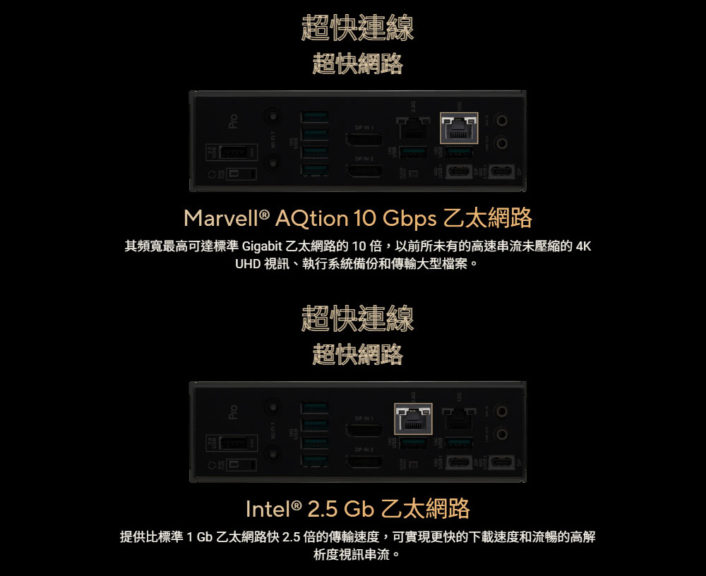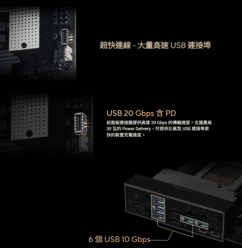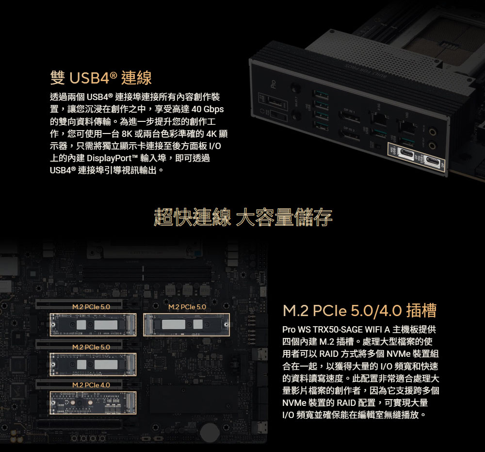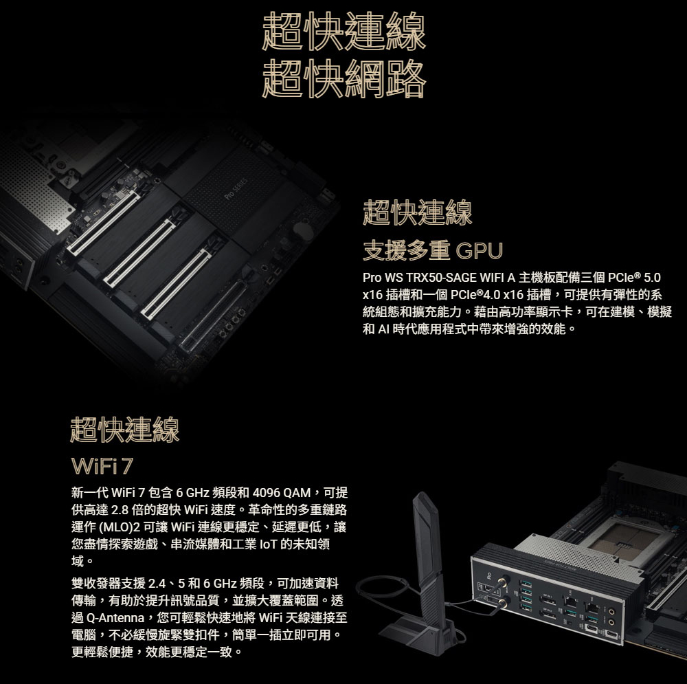 ✦ 超快連線:三個 PCIe® 5.0 x16 插槽、一個 PCIe® 4.0 x16 插槽、兩個 USB4 (40Gbps) 連接埠、10 Gb 和 2.5 Gb LAN 連接埠、四個 M.2 插槽、前置 USB 20Gbps Type-C® 連接埠,以及 SlimSAS NVMe 支援