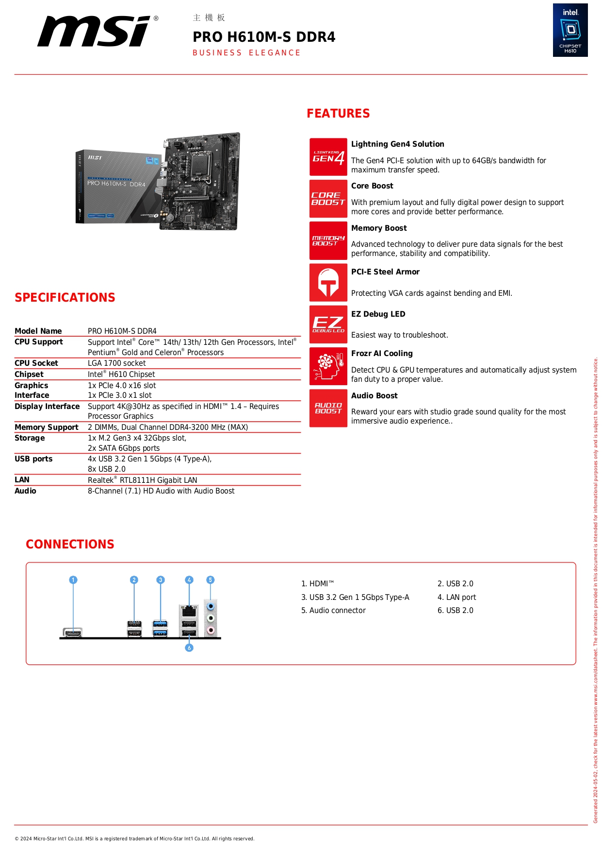 ■ 支援 LGA 1700 架構的 Intel® Core™ 14代/ 13代/ 12代處理器、Intel® Pentium® Gold 和 Celeron® 處理器