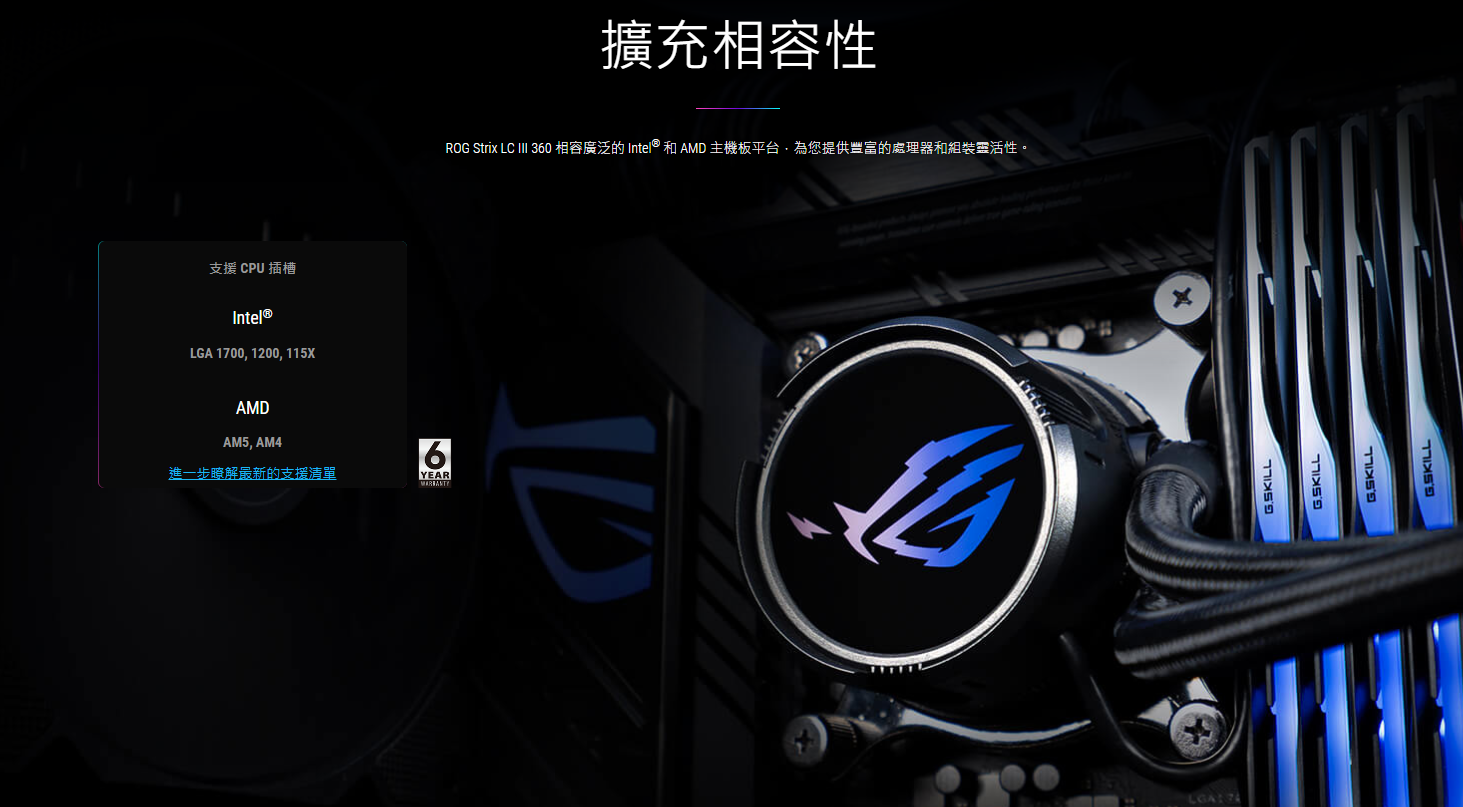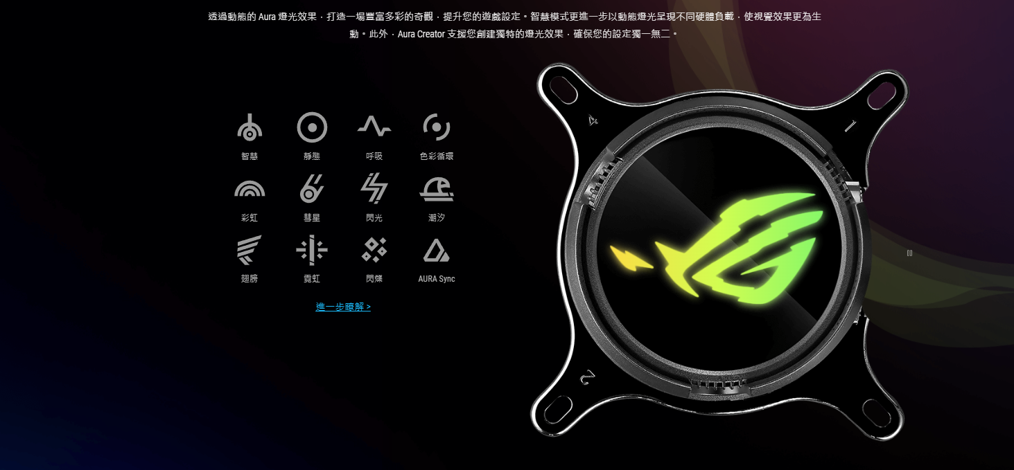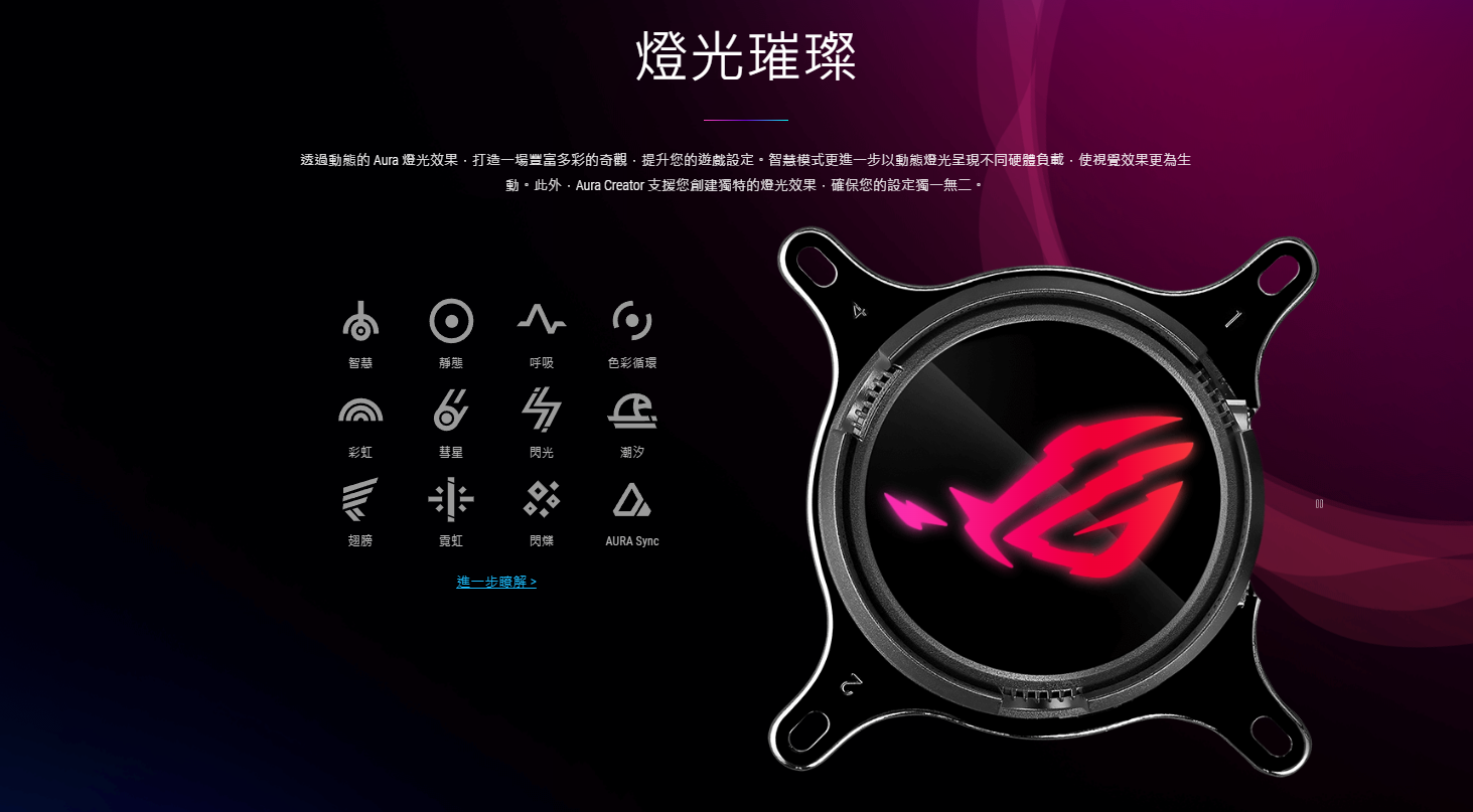 ● 全新水冷頭,配備 360 度可旋轉的 ROG 標誌和 10+ 種個人化 Aura 燈光效果
