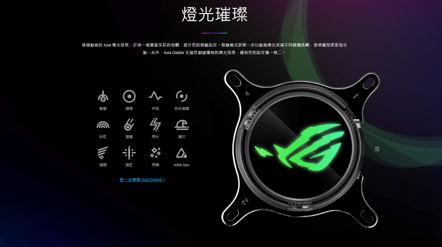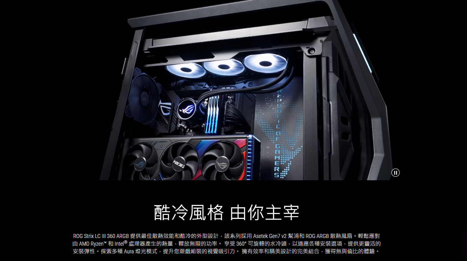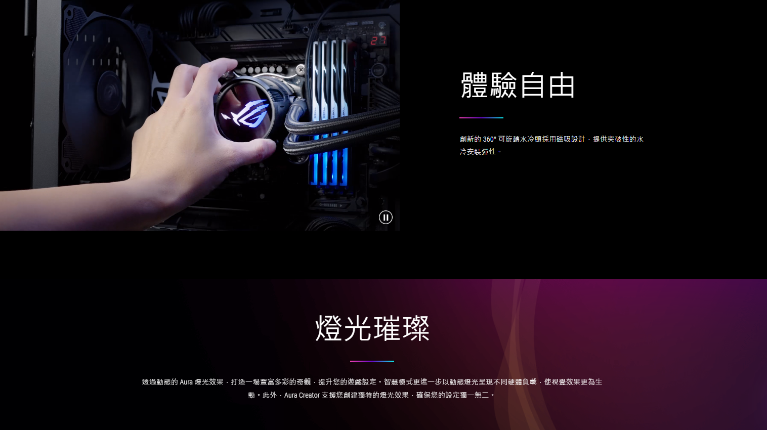 ● 全新水冷頭,配備 360 度可旋轉的 ROG 標誌和 10+ 種個人化 Aura 燈光效果