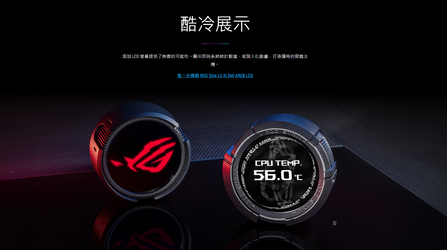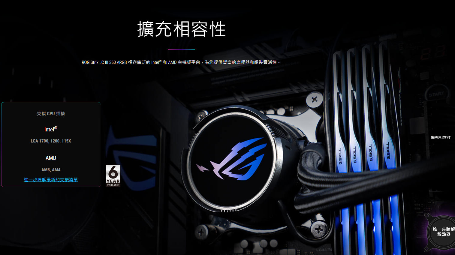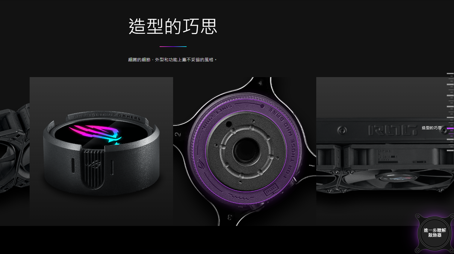 ● 全新水冷頭,配備 360 度可旋轉的 ROG 標誌和 10+ 種個人化 Aura 燈光效果