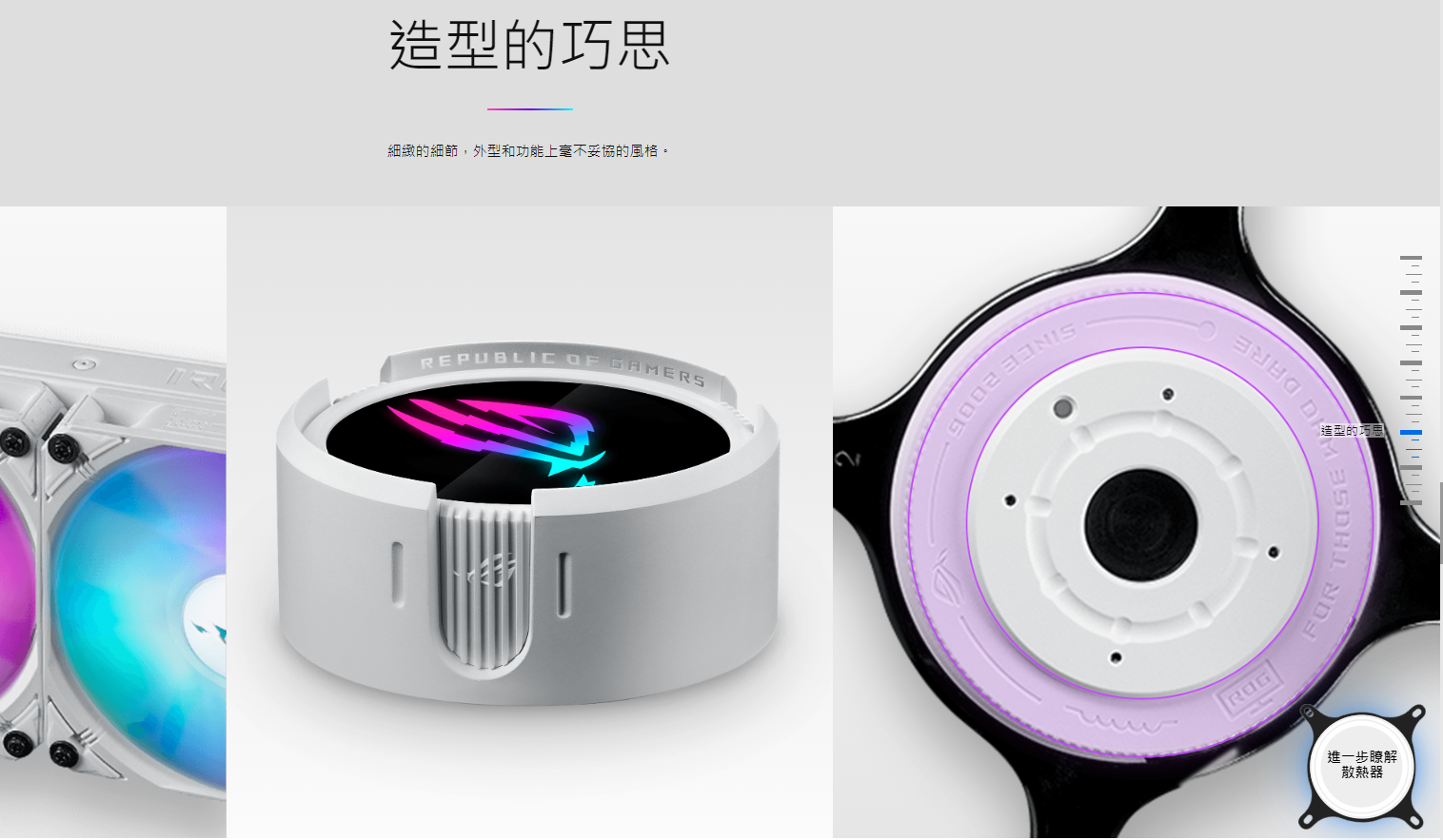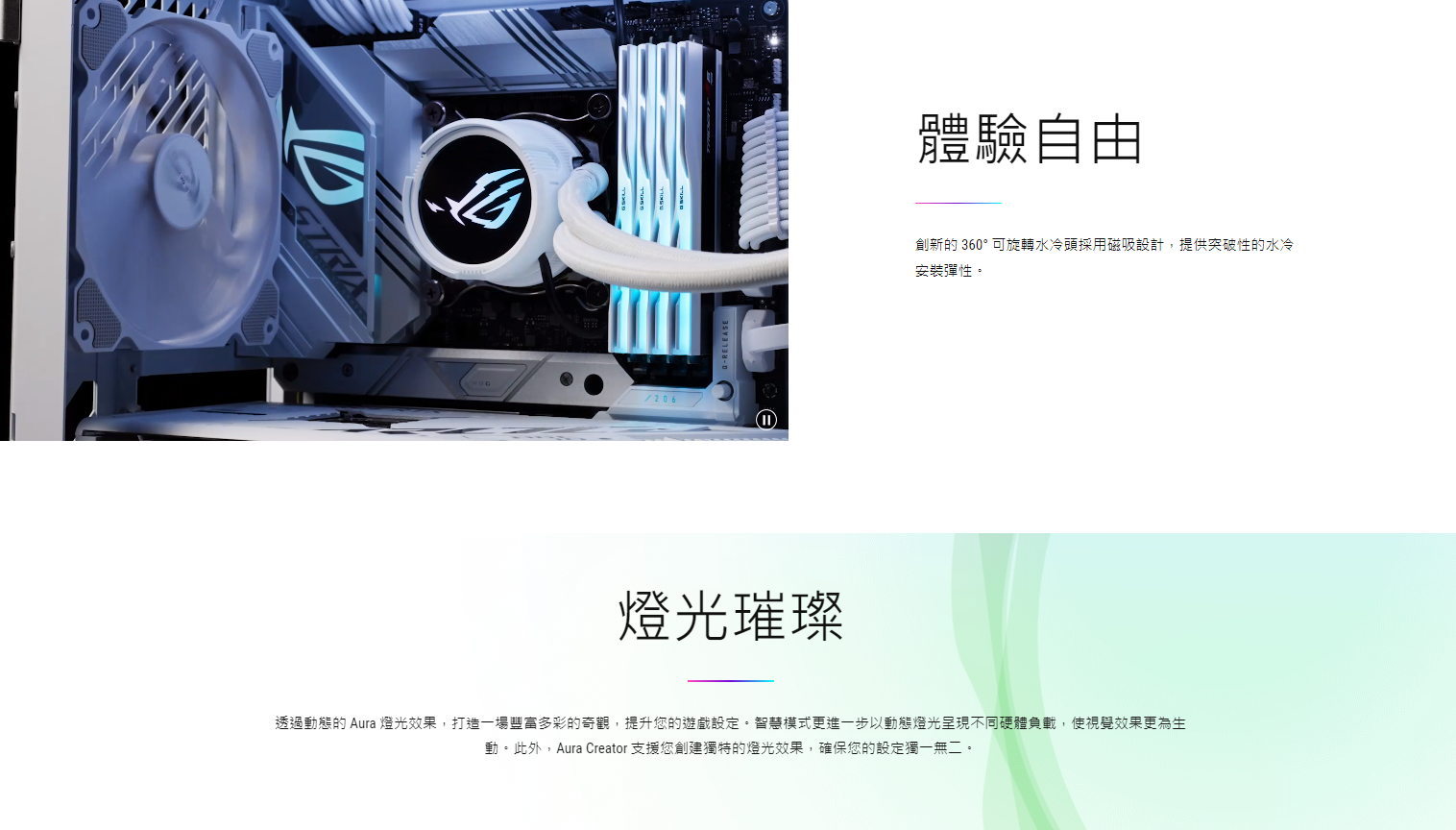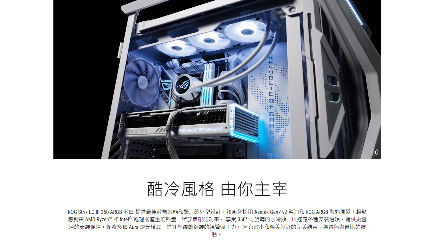 ● 全新水冷頭,配備 360 度可旋轉的 ROG 標誌和 10+ 種個人化 Aura 燈光效果