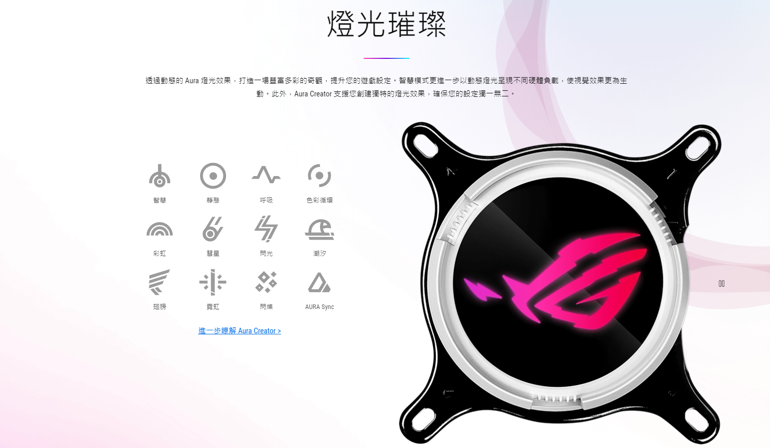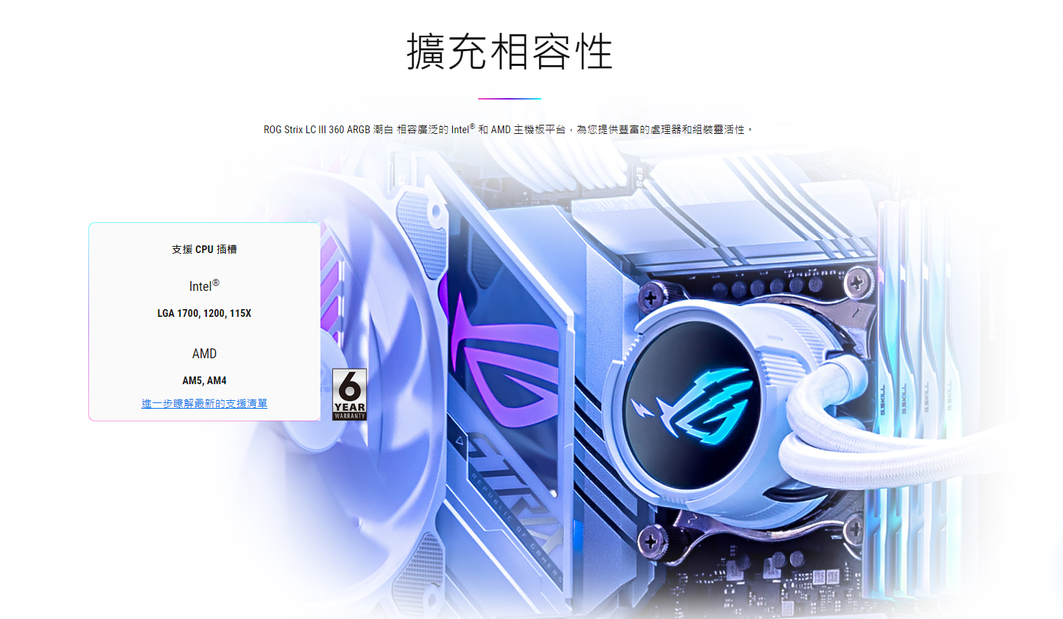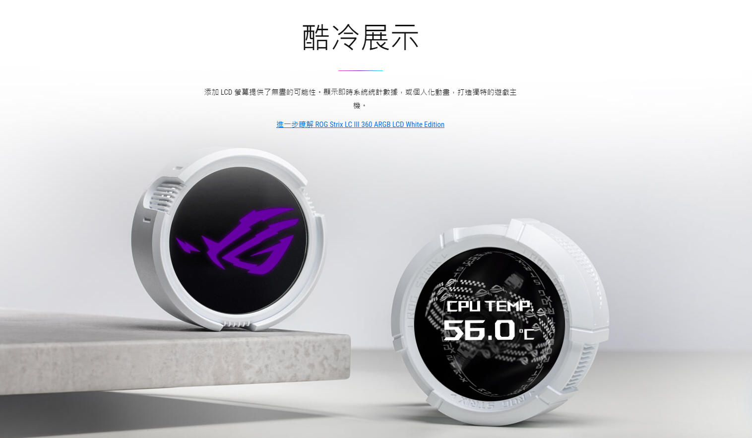 ● 全新水冷頭,配備 360 度可旋轉的 ROG 標誌和 10+ 種個人化 Aura 燈光效果
