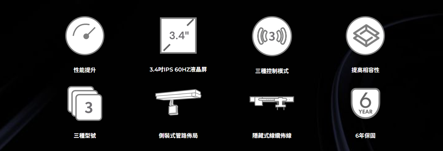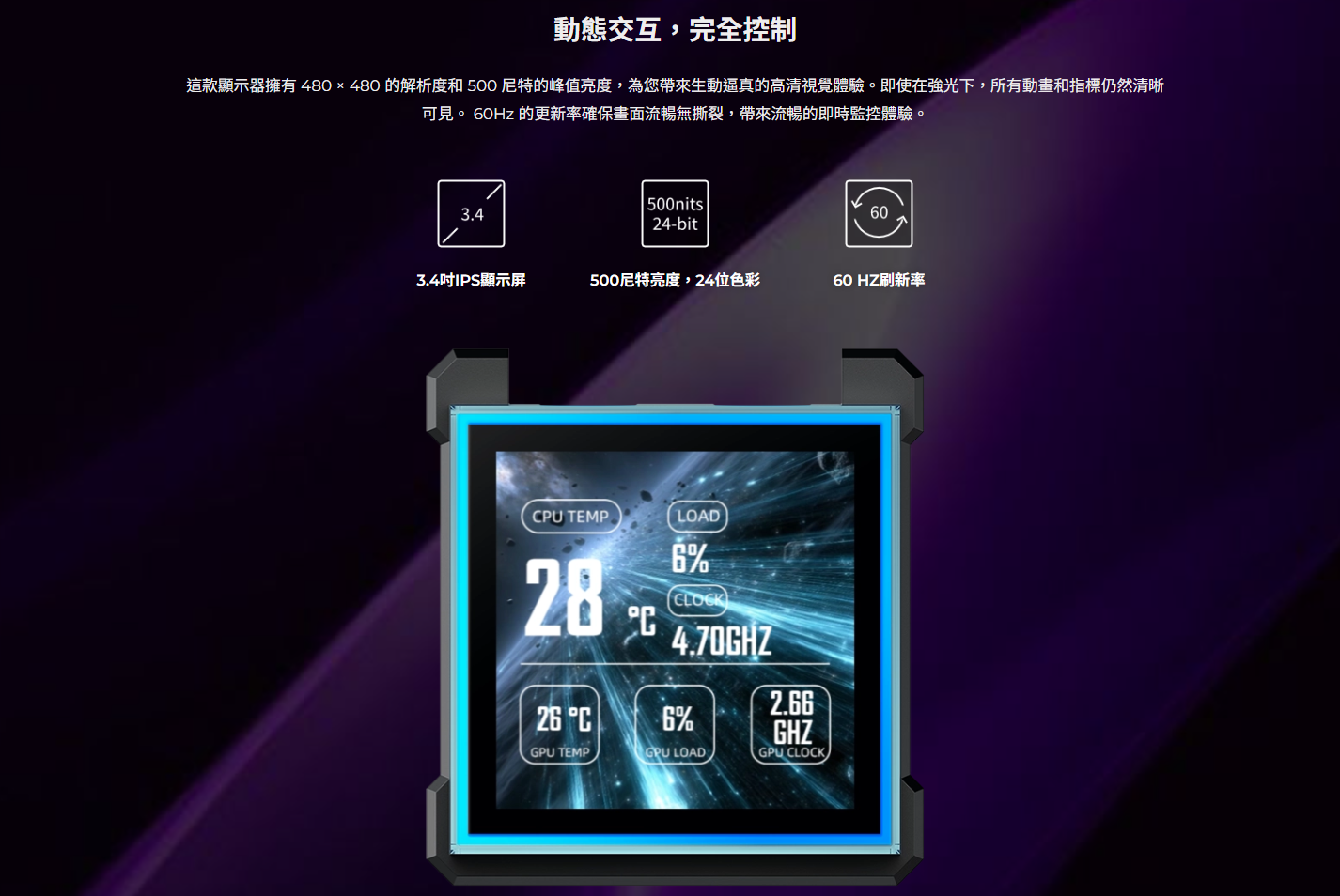 ✦ 3.4 吋 IPS LCD 顯示器(480×480,500 尼特,60 Hz),提供清晰的視覺效果、流暢的動畫和即時系統監控。