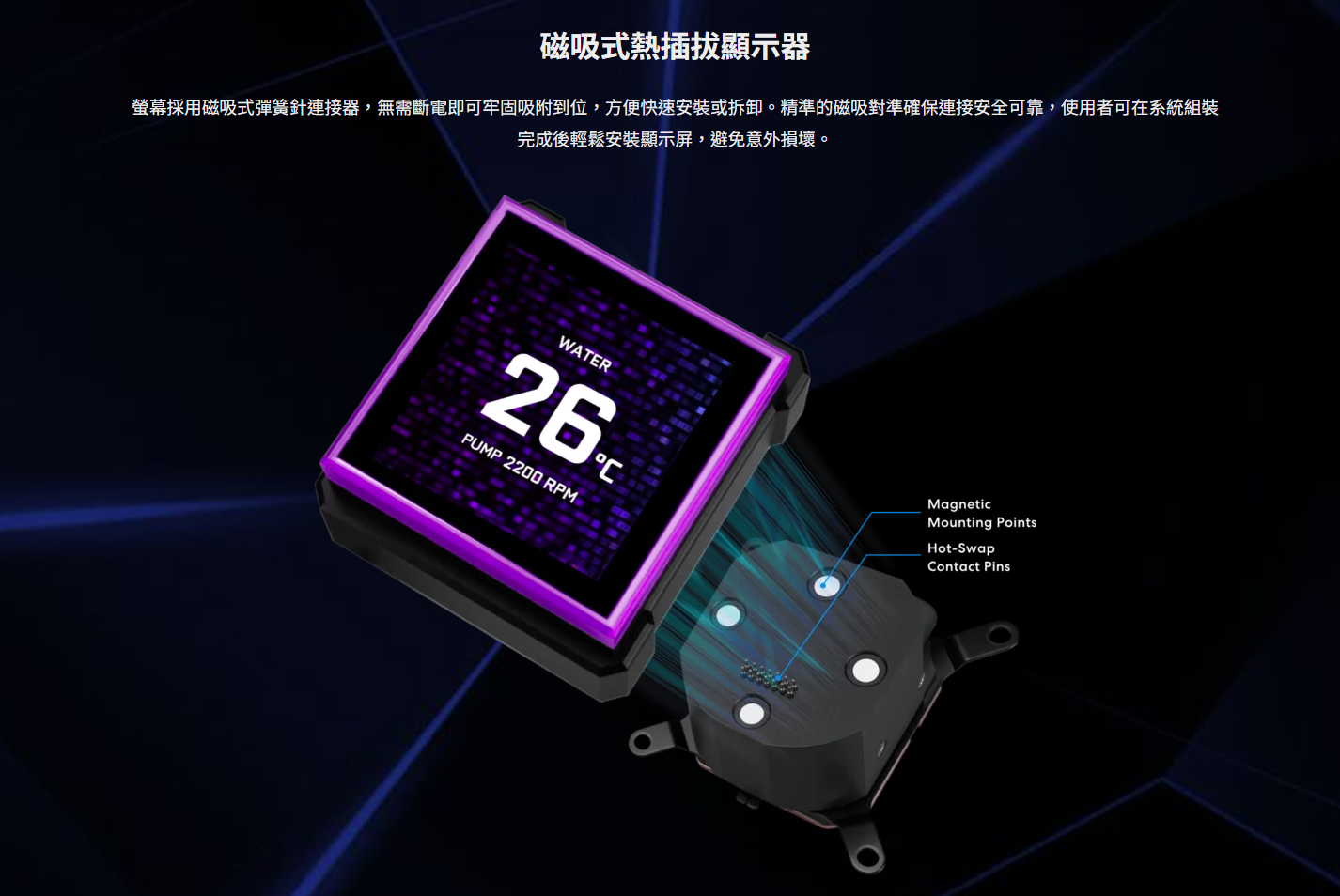 ✦ 磁吸式熱插拔液晶顯示器支架,無需關閉系統電源即可輕鬆安裝/拆卸。