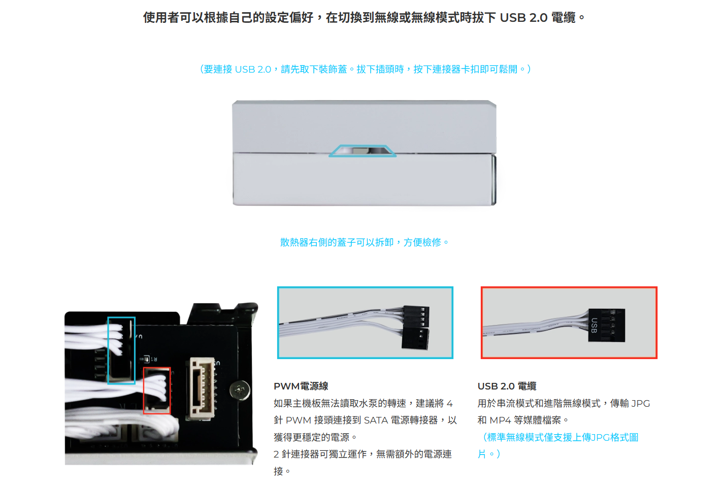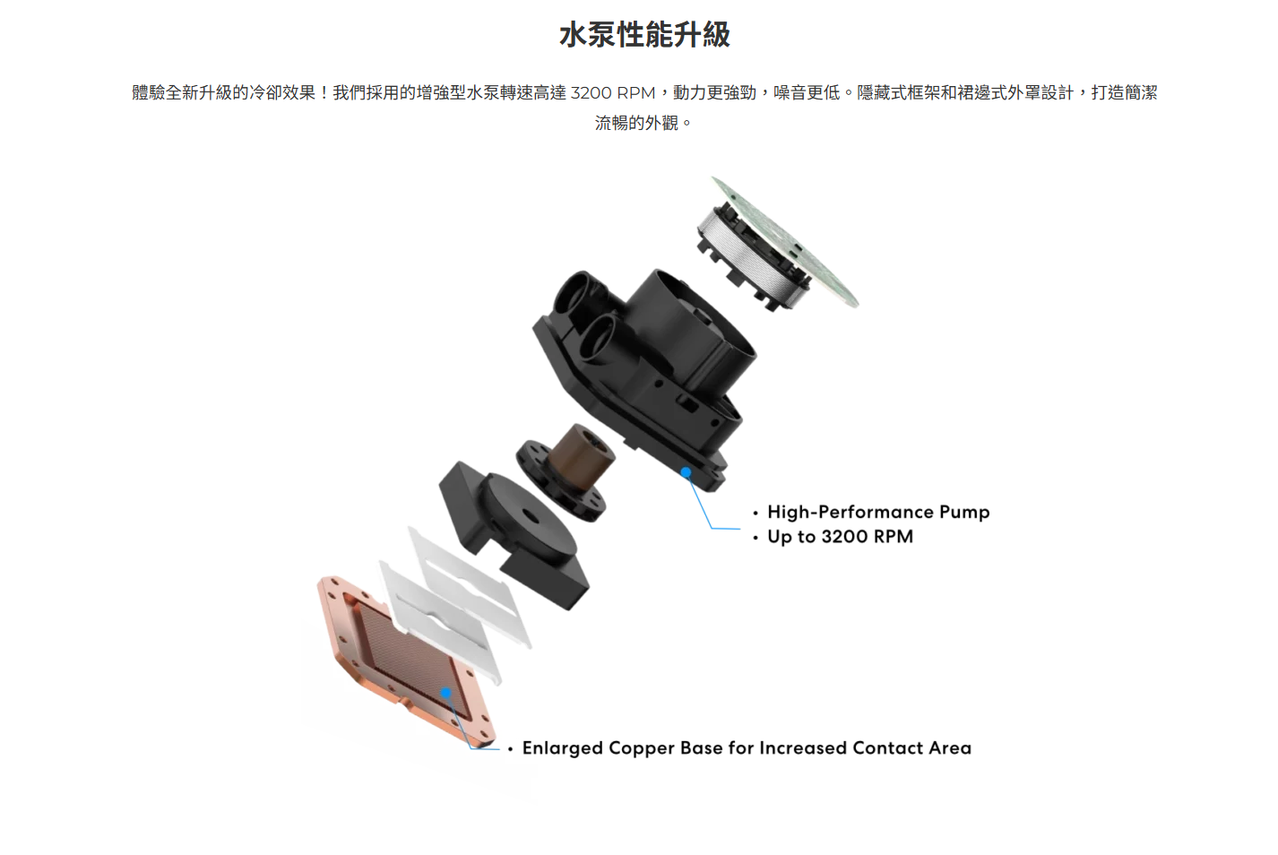 ✦ 升級後的高性能水泵,轉速高達 3200 RPM,噪音更低,冷卻效率更高。