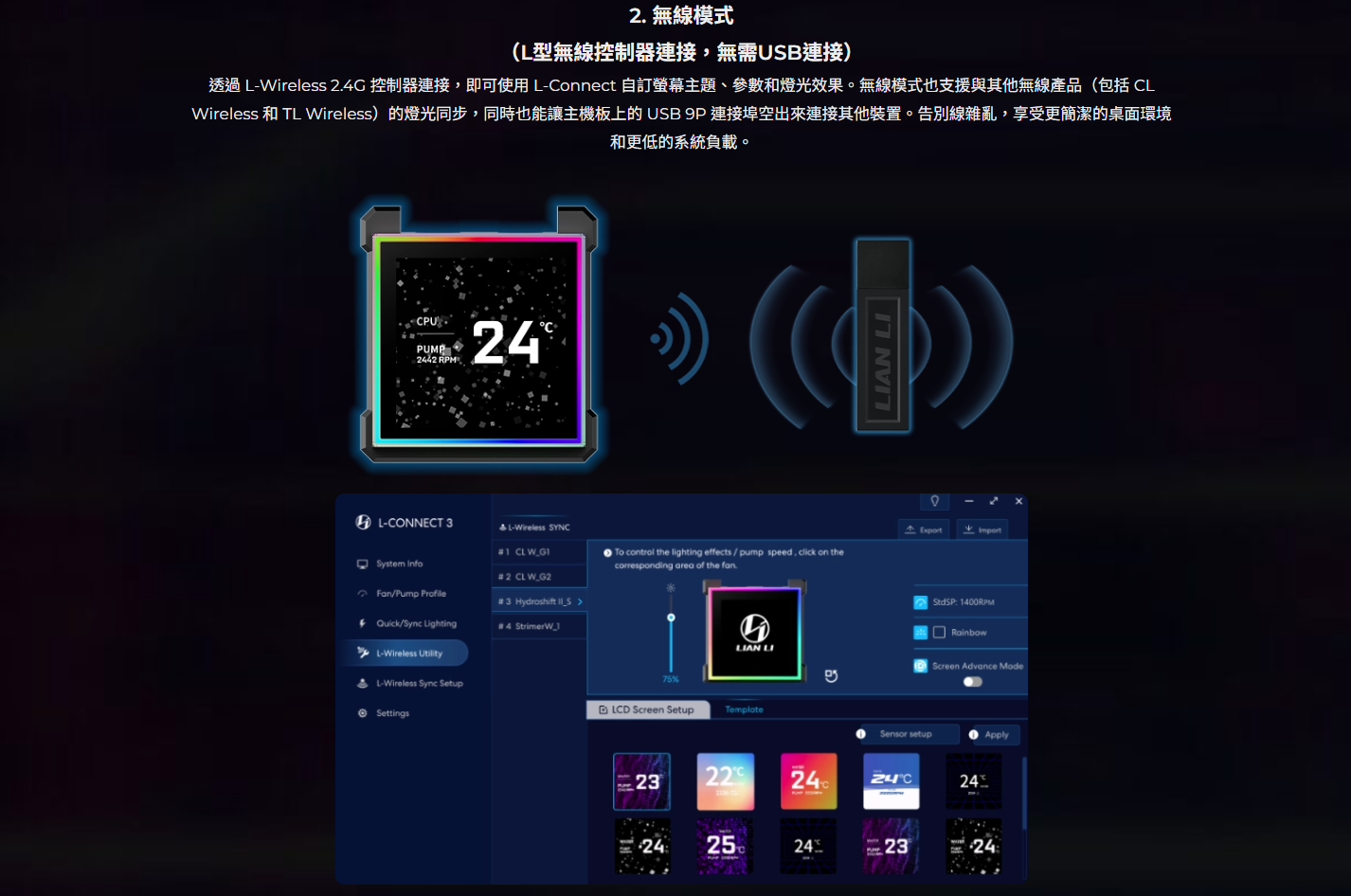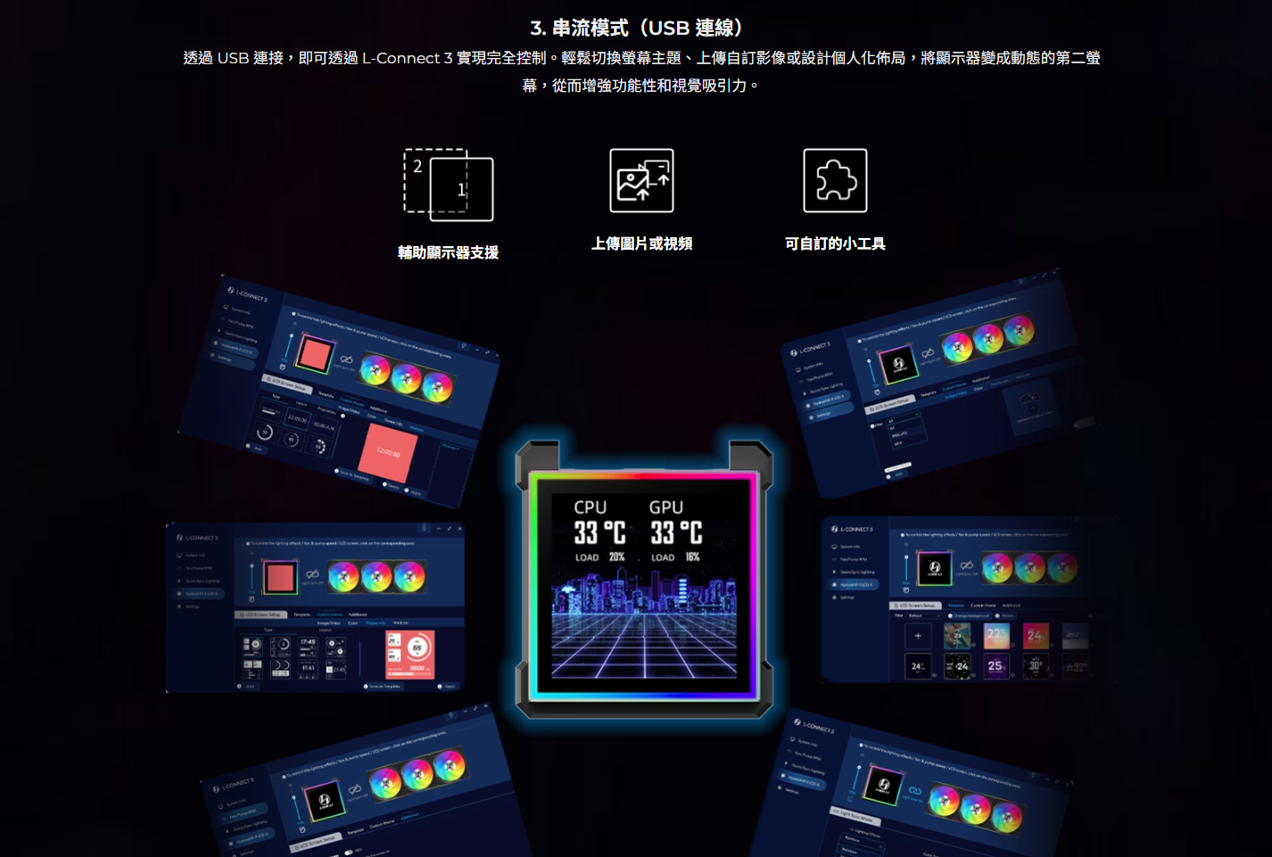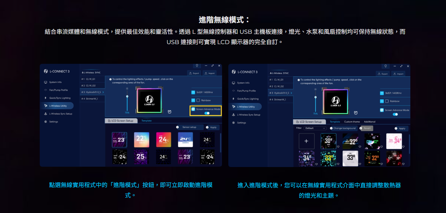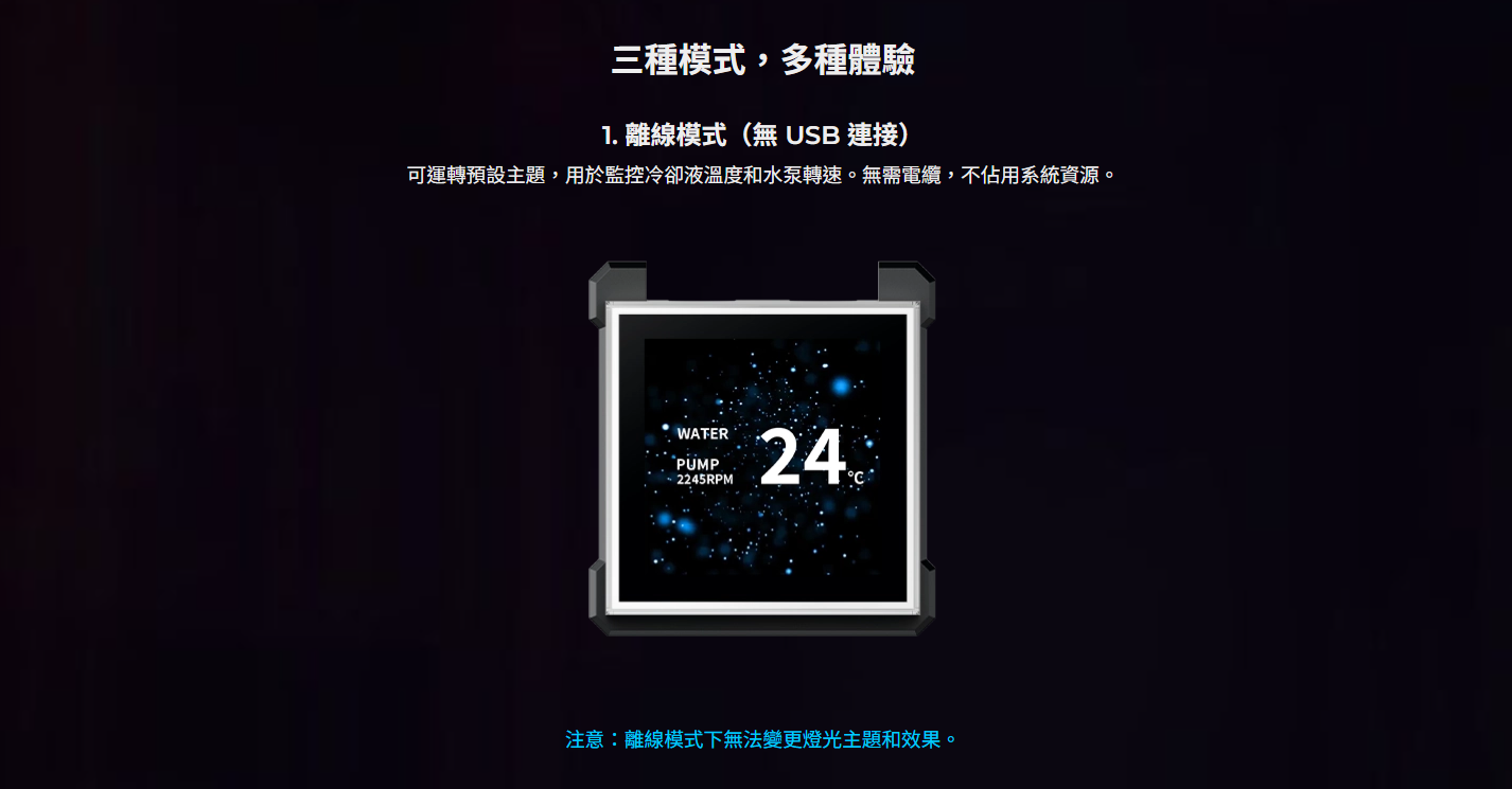 ✦ L-Connect 3 提供三種控制模式:離線、無線、USB 串流媒體(支援媒體上傳和自訂小工具)。