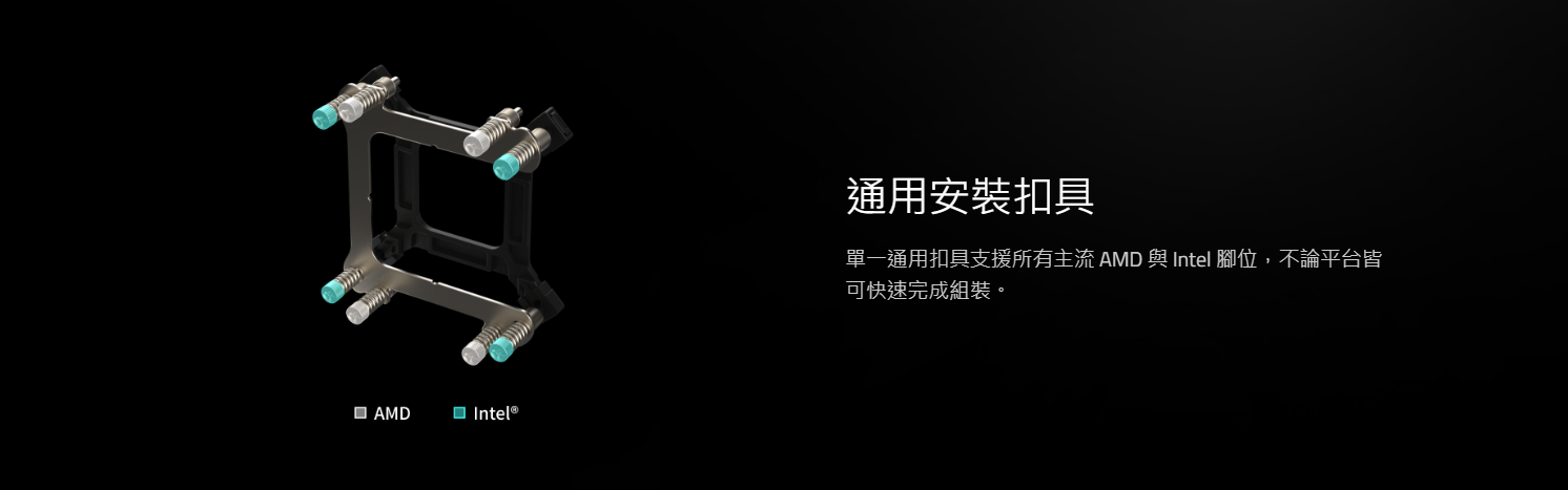 ✦ 通用安裝扣具,同時支援 AMD 與 Intel 平台