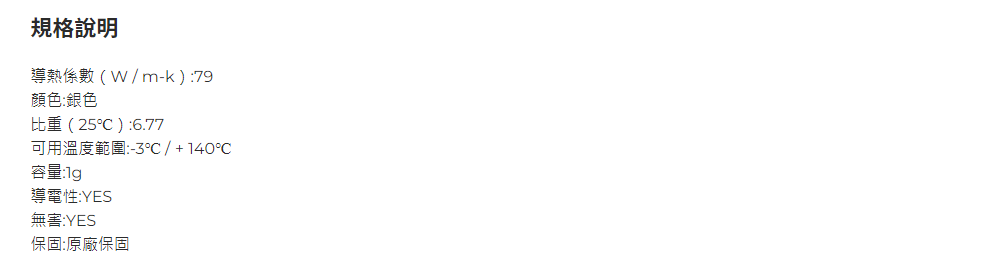 ✦ 無毒安全✦ 不可和鋁接觸✦ 在室溫下呈液態✦ 不含非金屬添加劑✦ 100%液態金屬合金組成✦ 對鋁以外的幾種材料具有高潤濕能力✦ 原廠保固