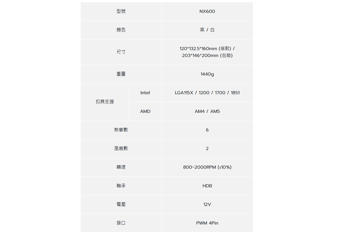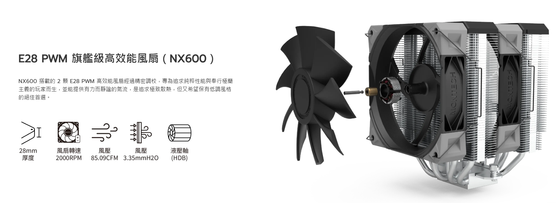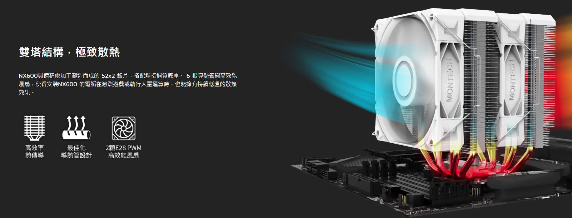 Montech NX600 白 6導管/高16/雙塔雙扇/FDB軸 28mm風壓扇