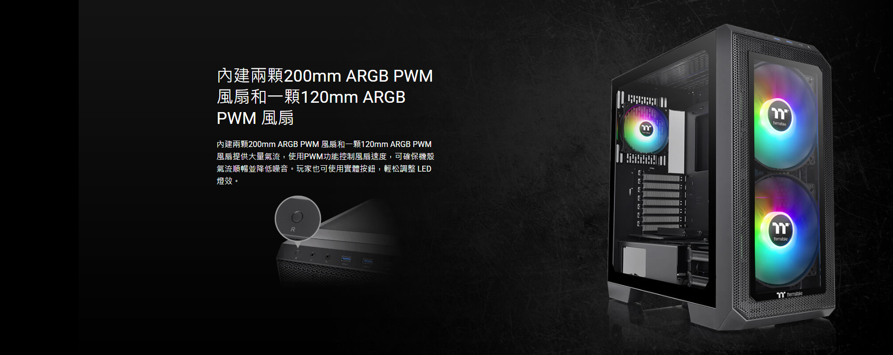 光透 View 300中直立式機殼採用雙前面板設計,內建前方兩顆200mm ARGB PWM主板連動風扇,及後方一顆120mm ARGB PWM主板連動風扇,提供最佳散熱性能,也讓玩家輕鬆打造專屬的風格。