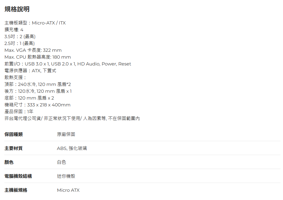 ☆ 無A柱設計☆ 支援 240mm 水冷及 180mm 風冷☆ 支援顯卡長度 322mm