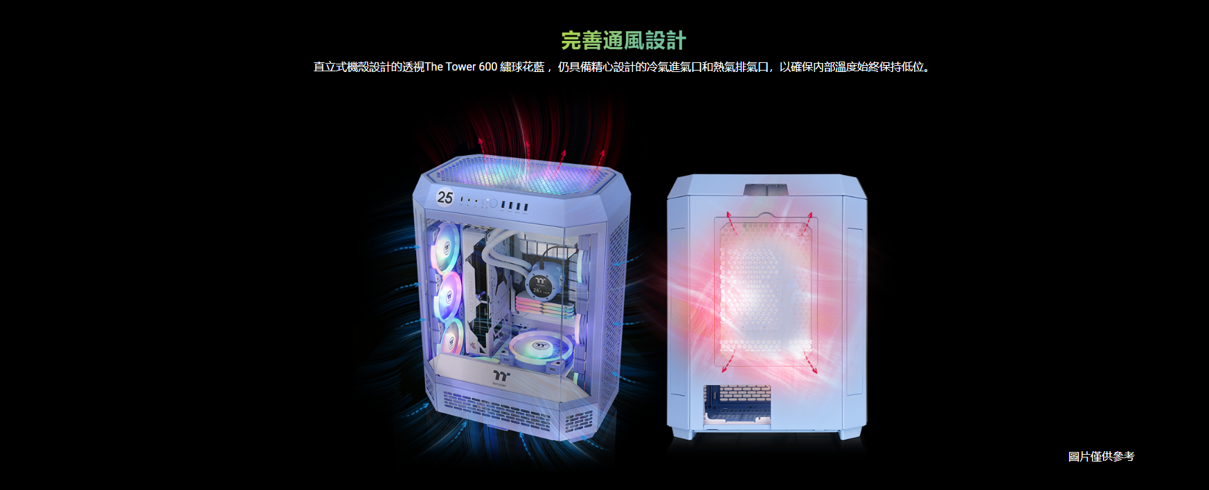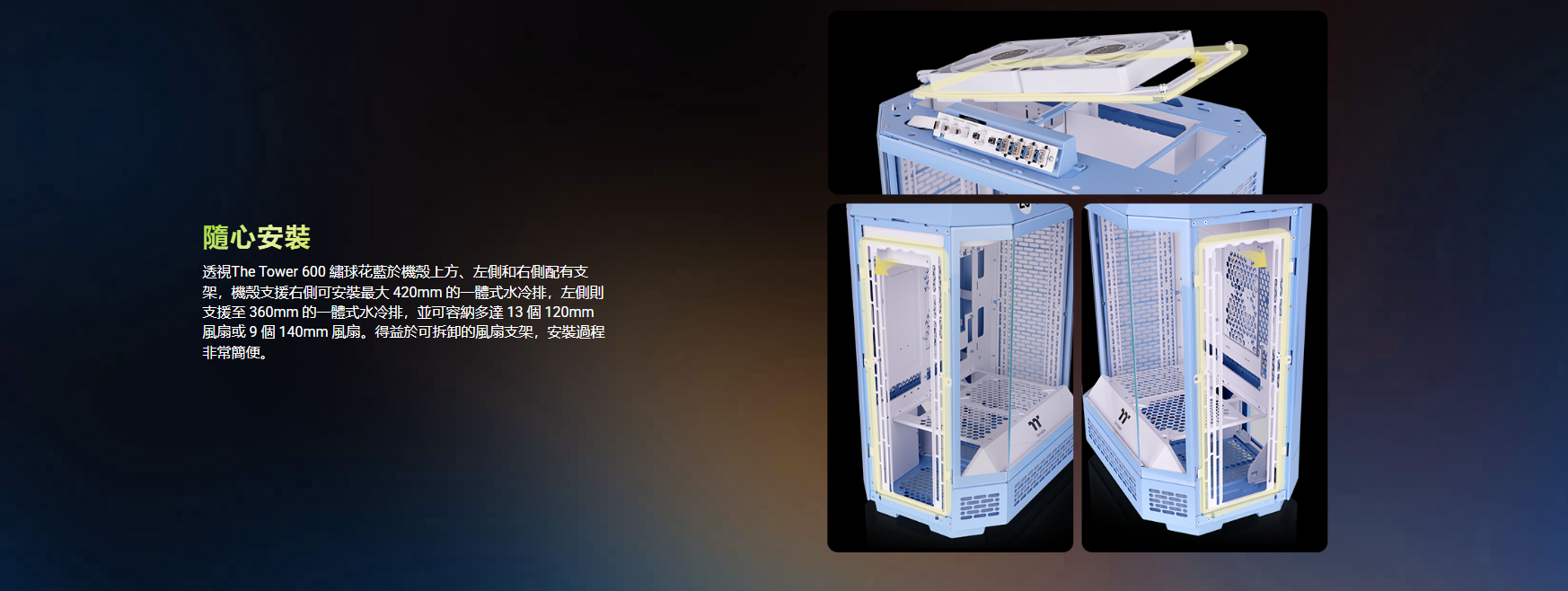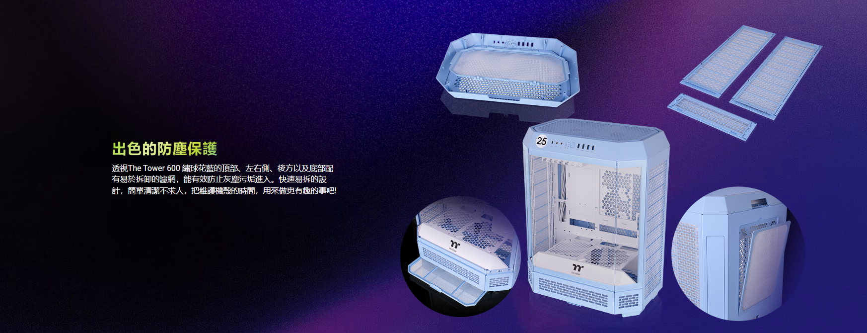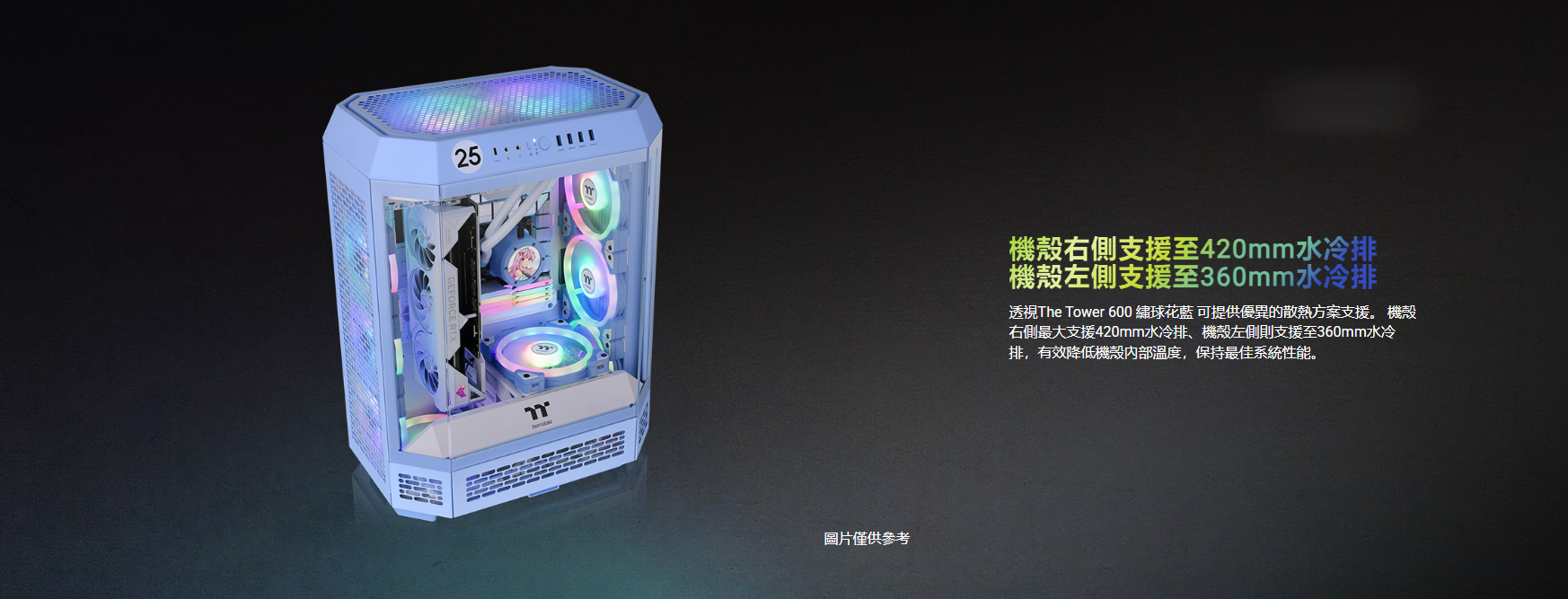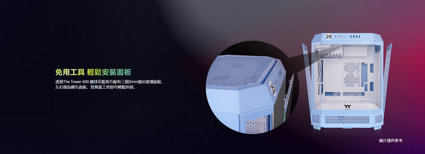 曜越 The Tower 600 繡球花藍 顯卡長28(40)/U高21/全景直立/三面玻璃/支援背插(限ATX)