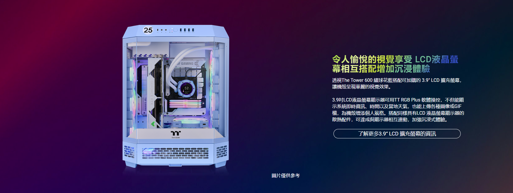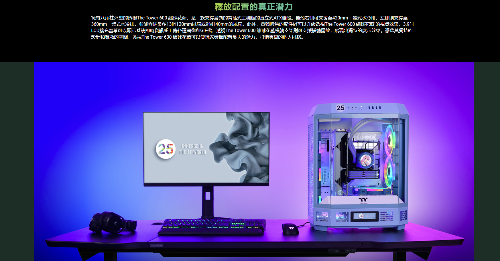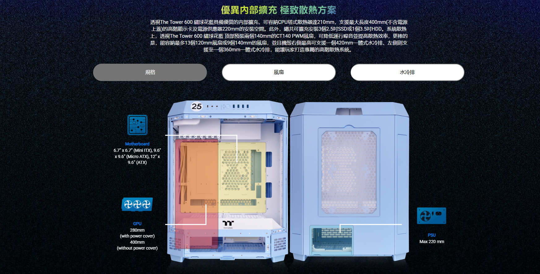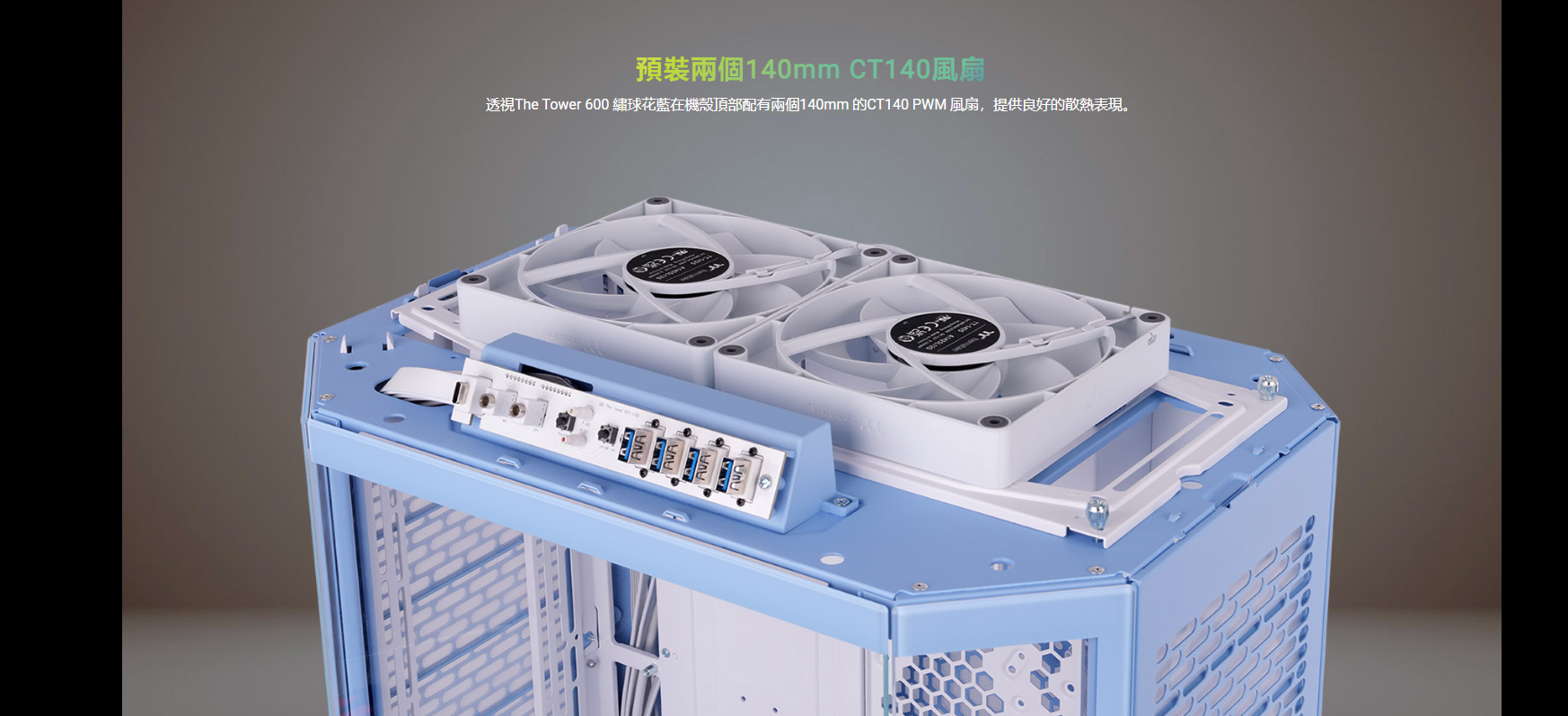 曜越 The Tower 600 繡球花藍 顯卡長28(40)/U高21/全景直立/三面玻璃/支援背插(限ATX)