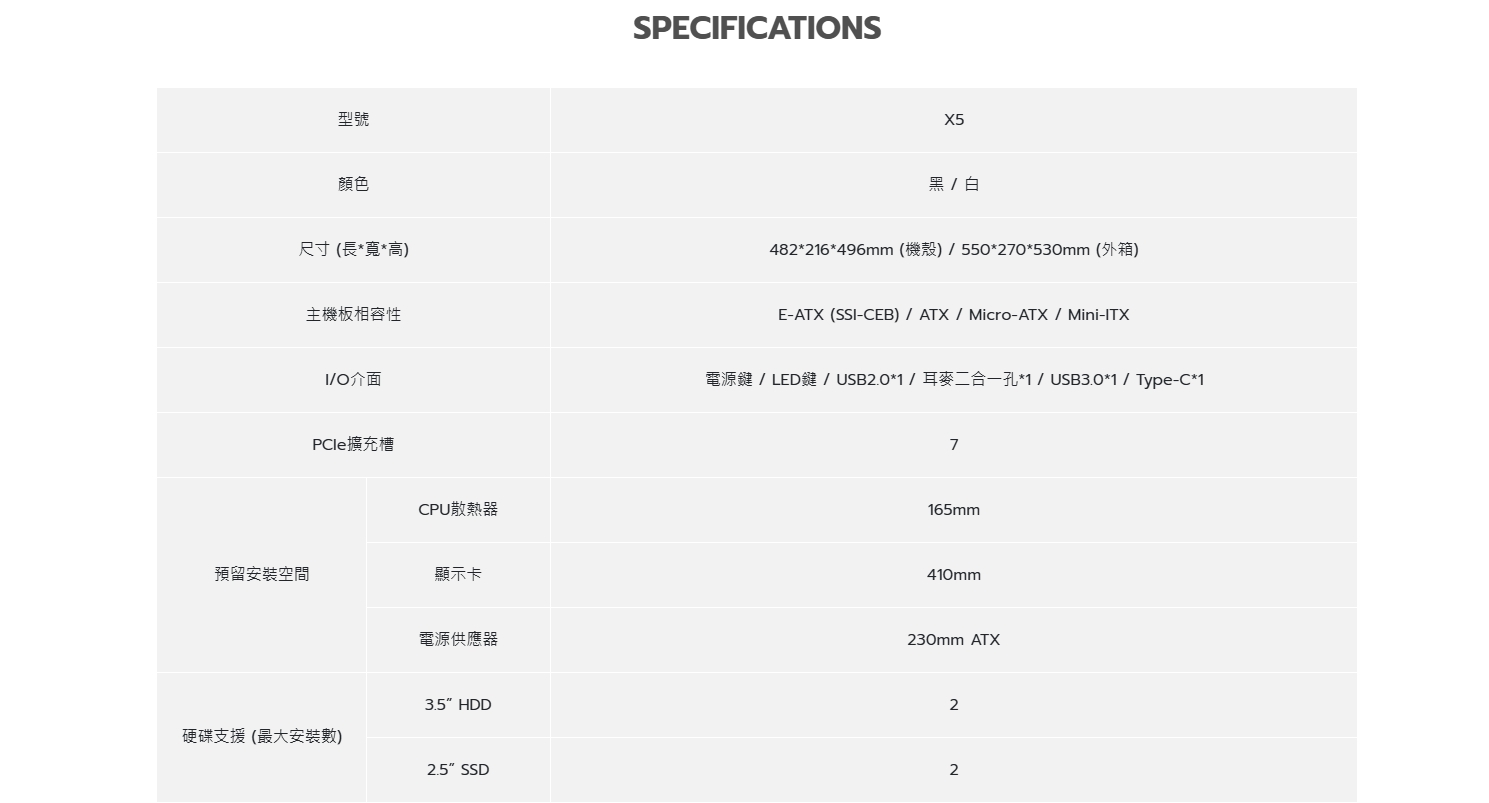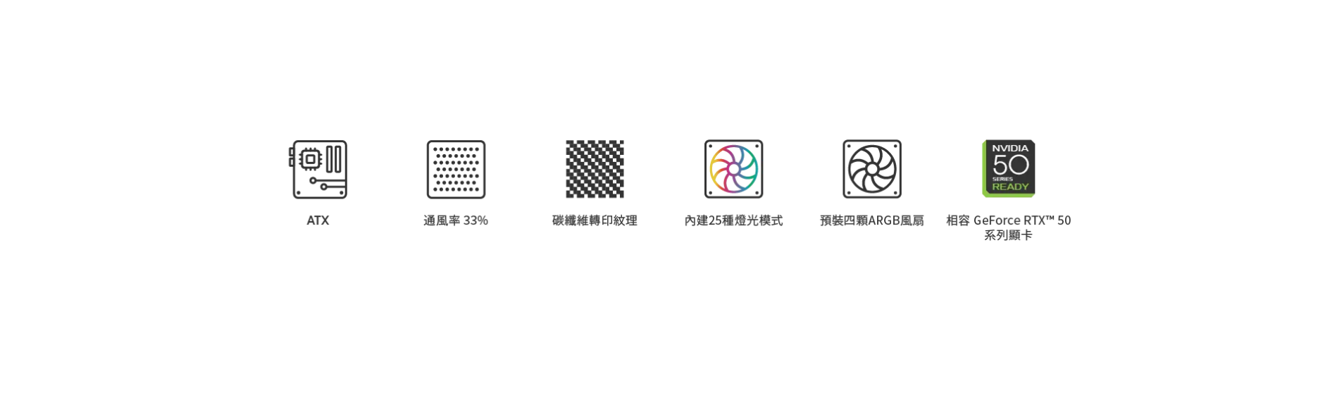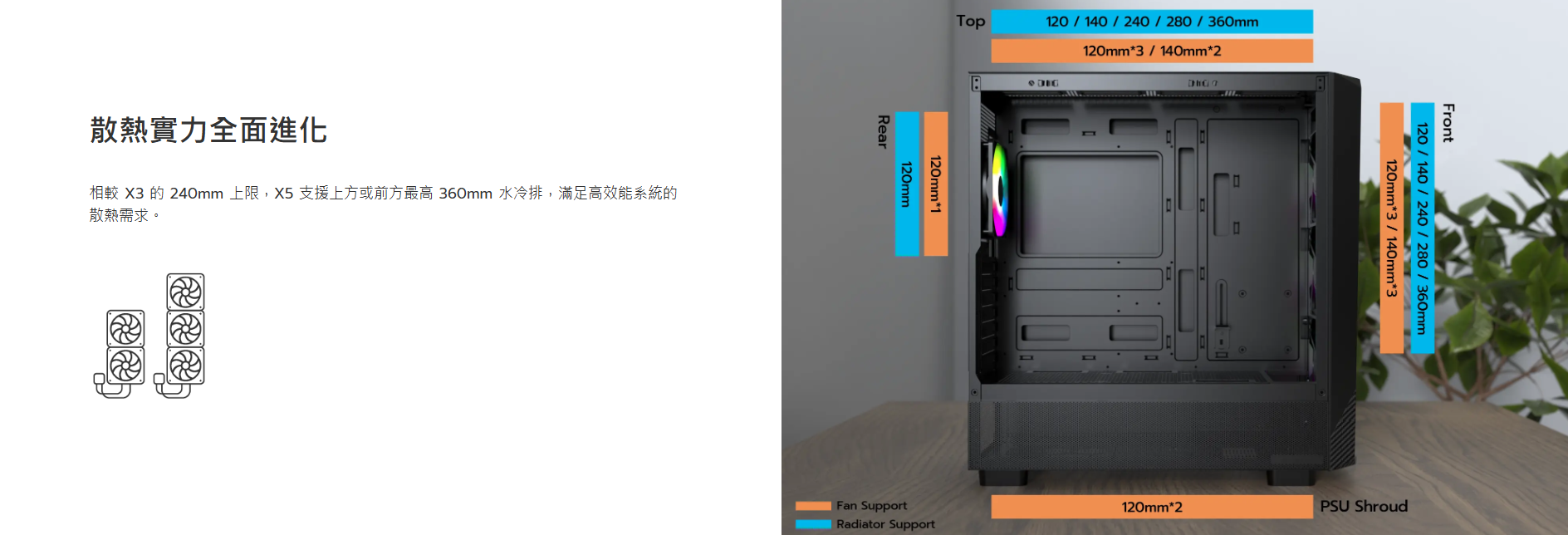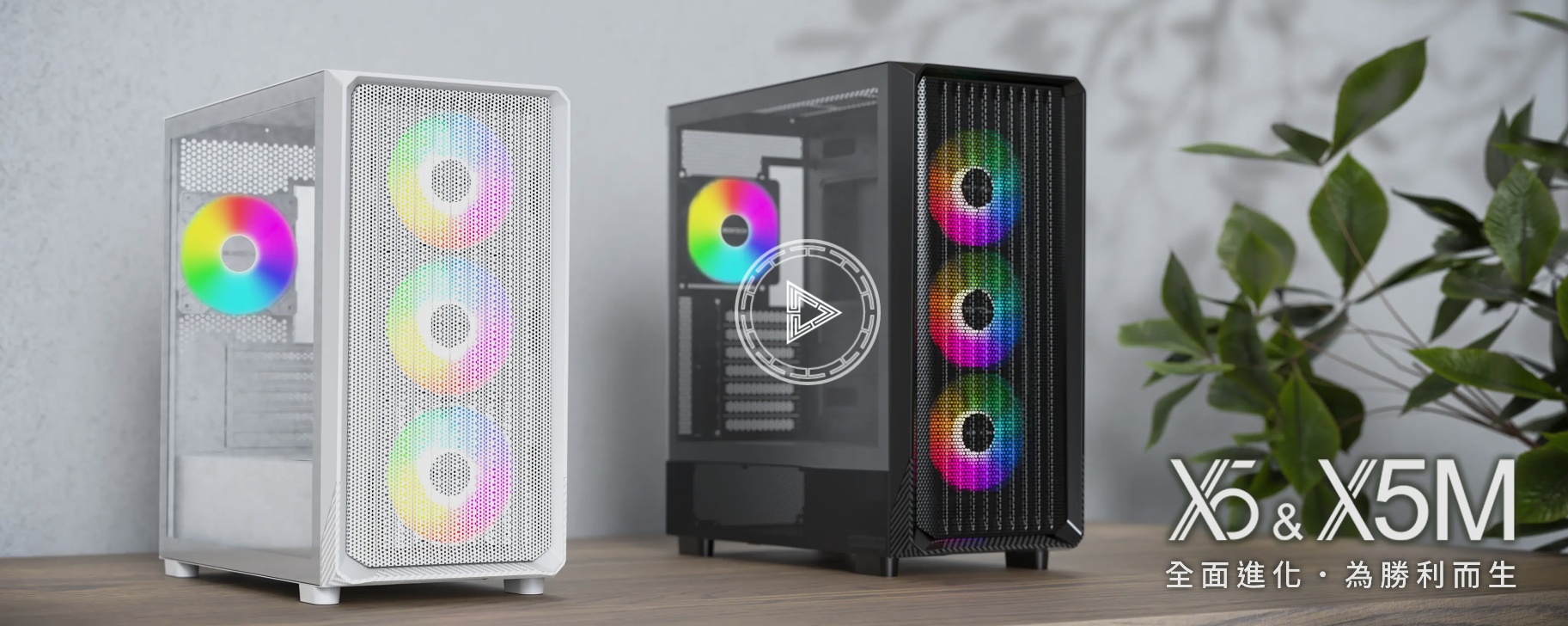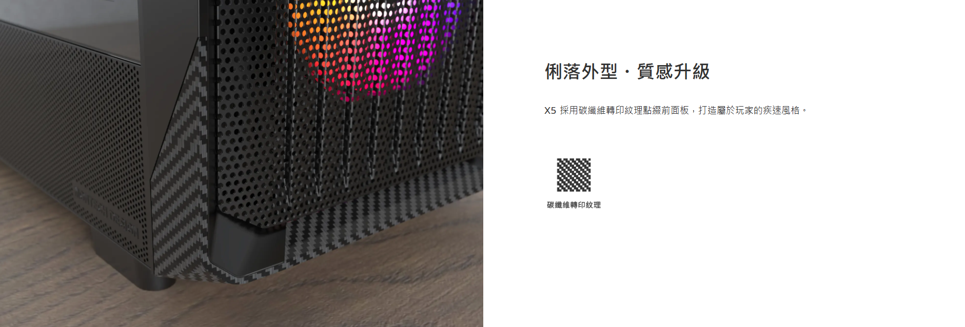 承襲 X3 的熱血基因,X5 全面升級——完美融合碳纖維轉印紋理、硬體兼容性更強、燈效從固定 RGB 蛻變為可自訂 ARGB,給你最純粹的沉浸式體驗。專為玩家、創作者與重度裝機玩家而生,X5 是新世代電競機殼的強勢進化!