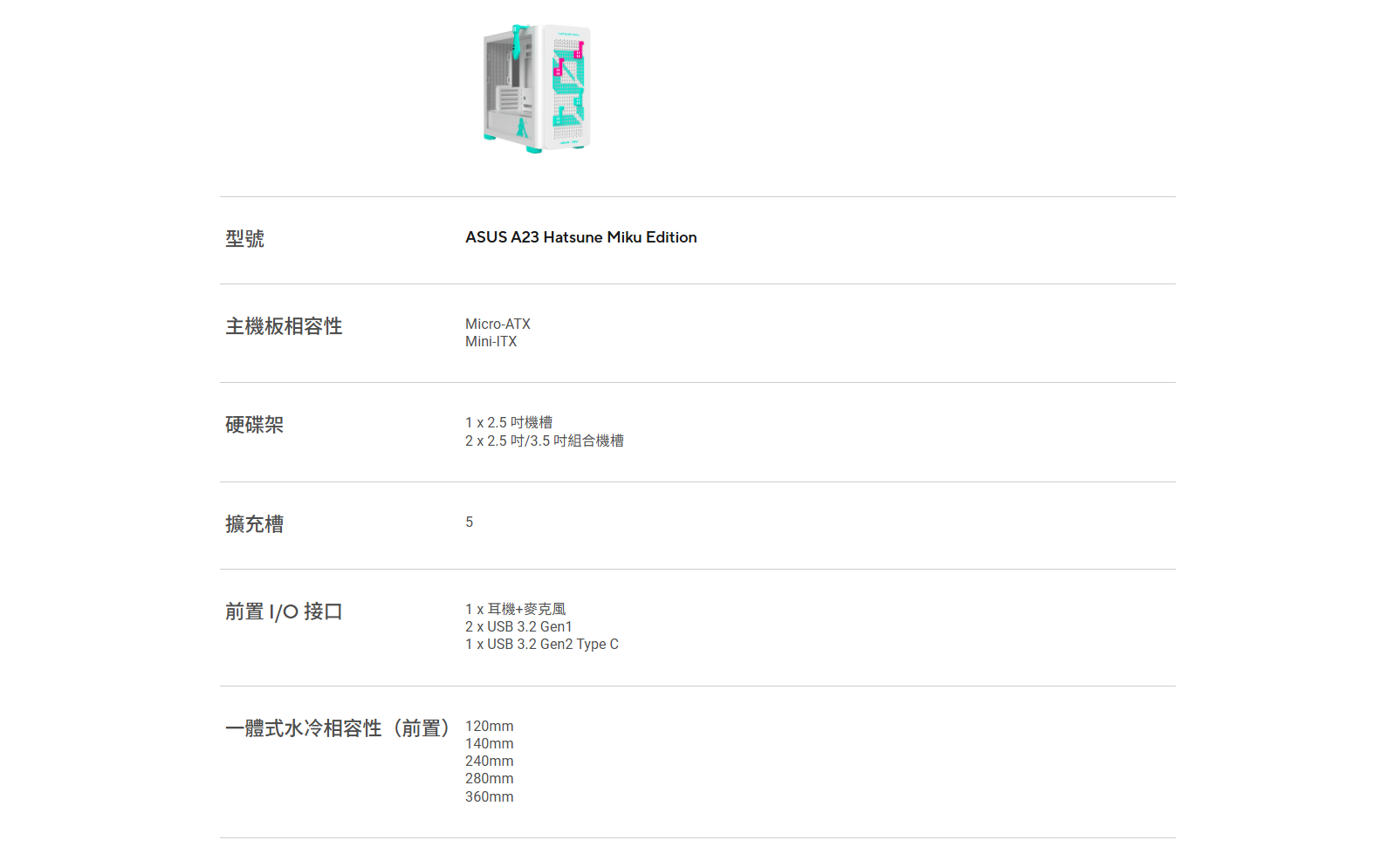 ✦ 絕佳的擴充相容性: A23 初音未來特別版可支援長達 360 mm 的水冷排、380 mm 的高階顯示卡,以及高達 165 mm 的 CPU 散熱器。