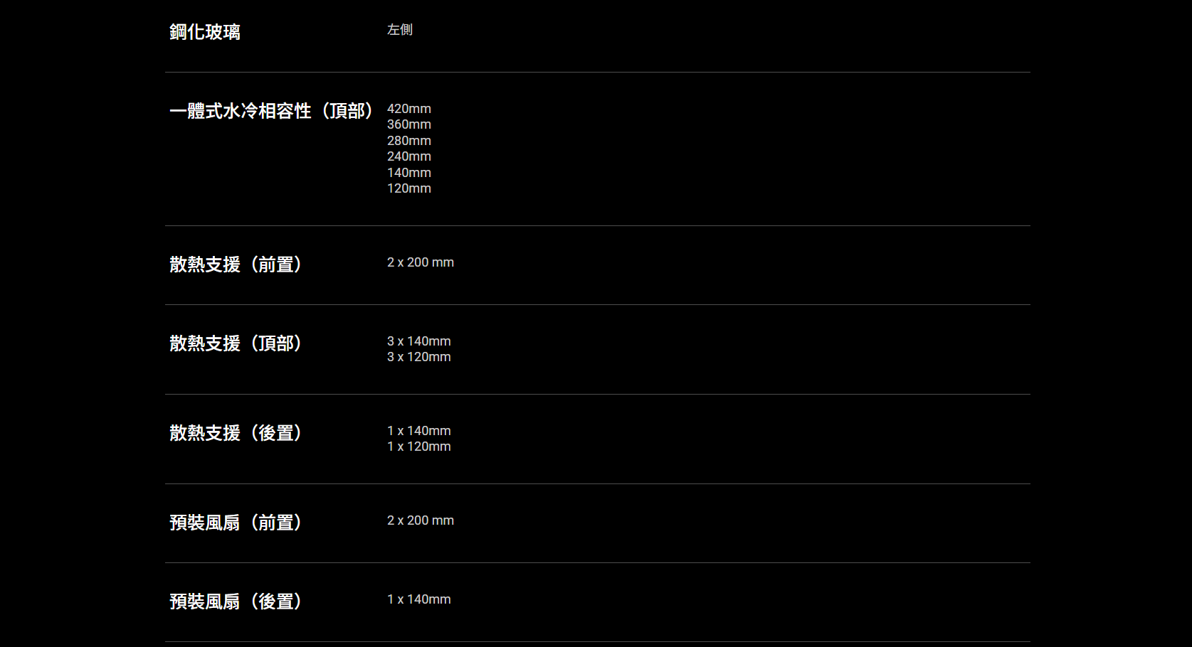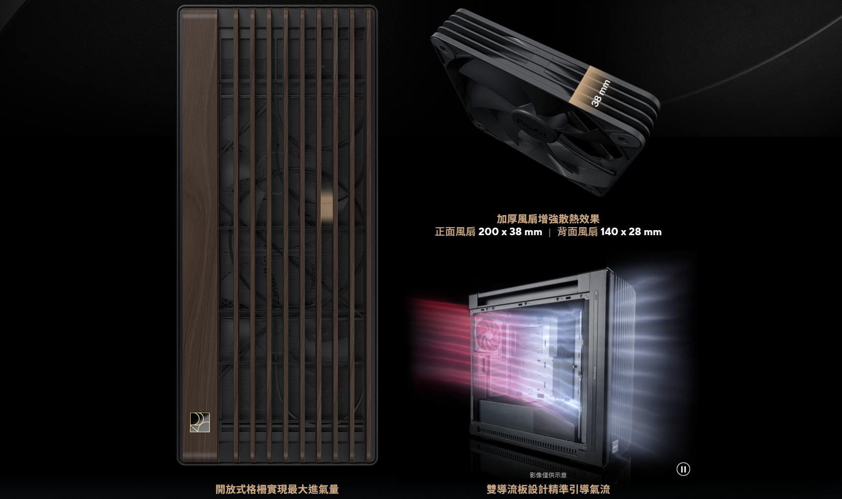 ✦ 極致氣流,強勢吸入: 前面板採用高孔隙率格柵設計,預裝兩顆 200 x 38 mm 特厚風扇以實現最大進氣量,並搭配一顆 140mm 後置排氣風扇