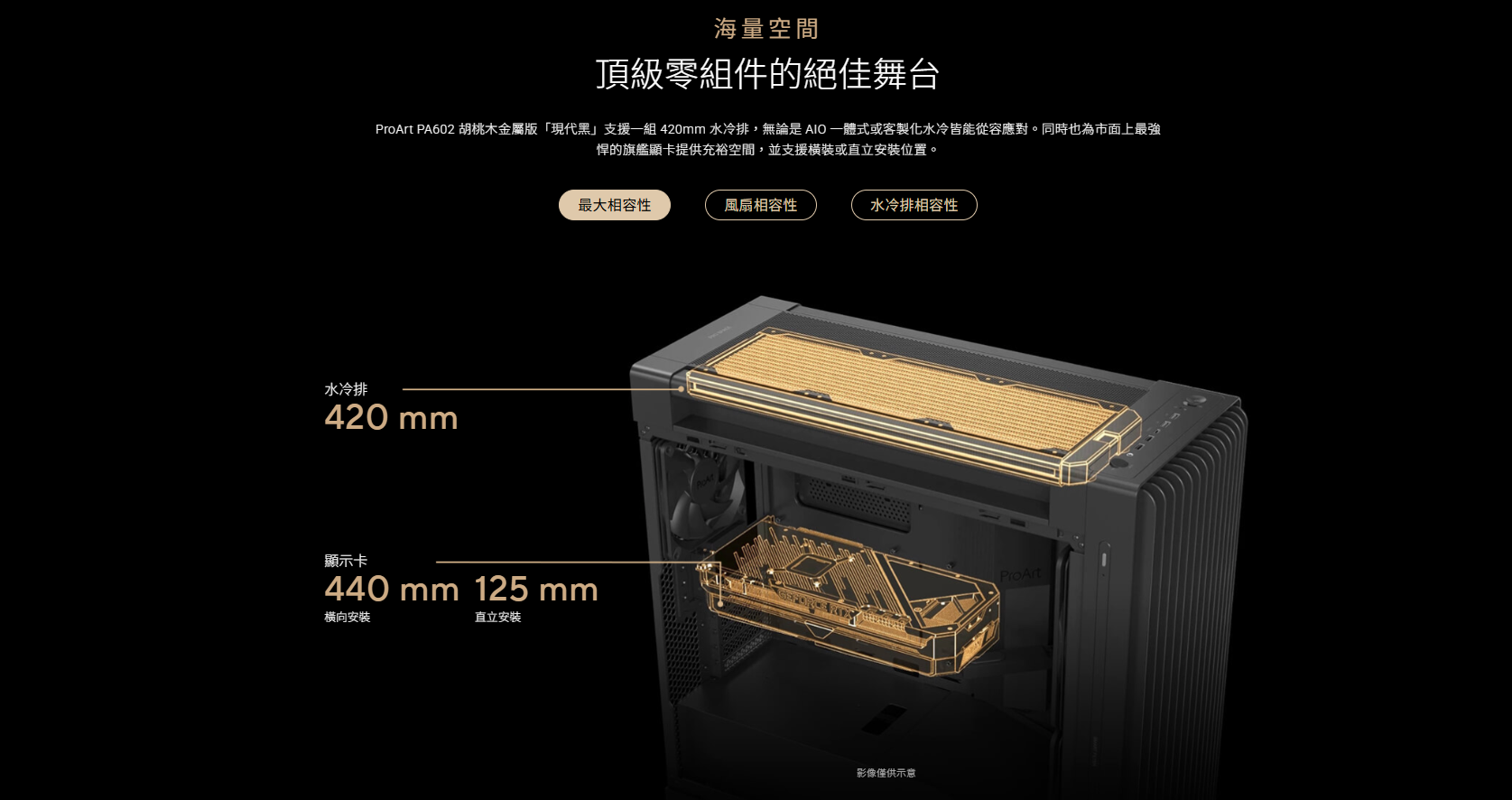 ✦ 海量空間,極限擴充: 支援長達 440mm 的顯示卡,可容納單組 420mm AIO 一體式或客製化水冷排,為最頂級的旗艦顯卡提供充裕的橫裝或直立安裝空間