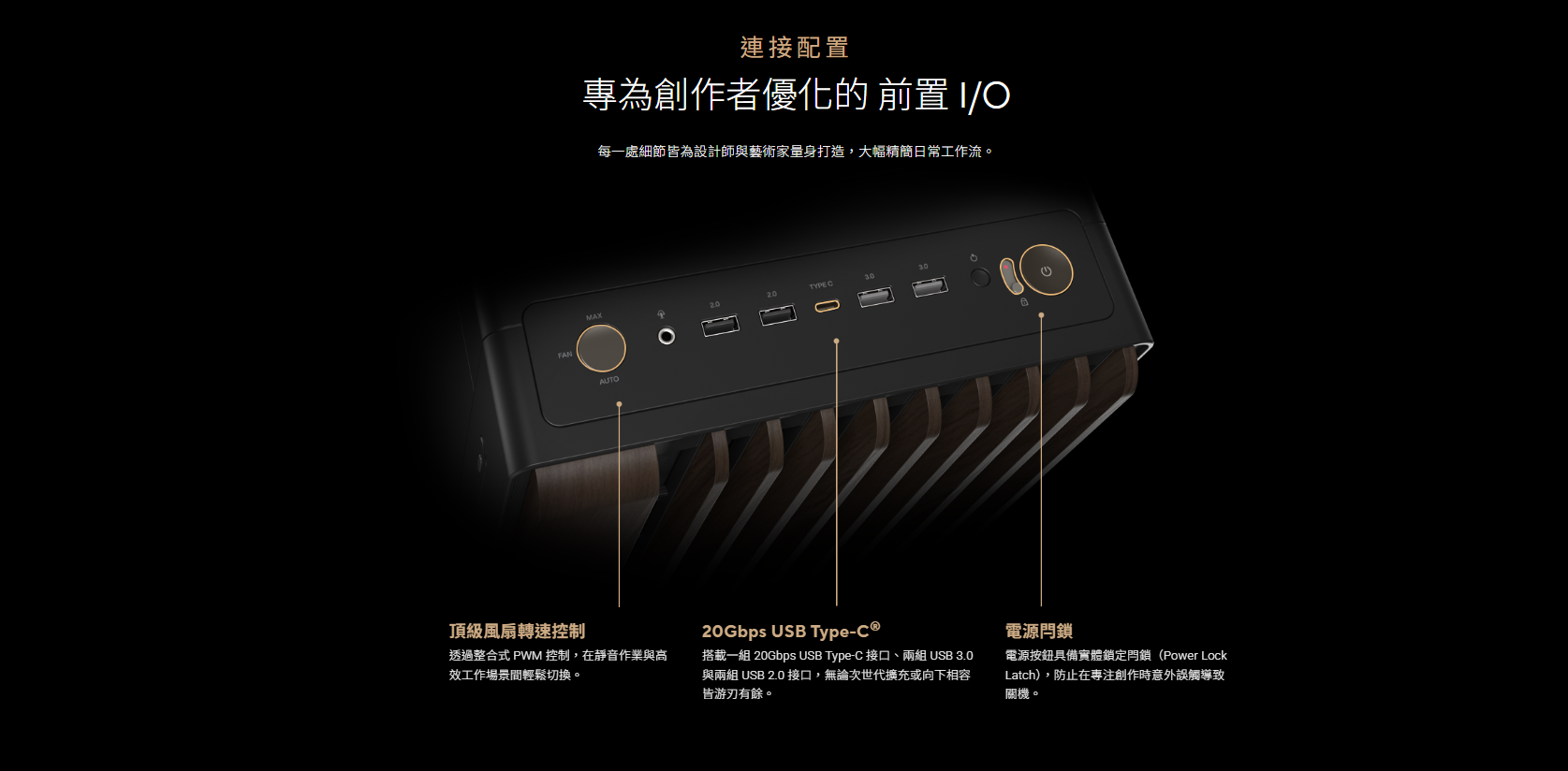 ✦ 豐富 I/O 介面: 配備電源閂鎖與兩段式 PWM 風扇控制切換;搭載 USB Type-C 20Gbps 高速連接埠