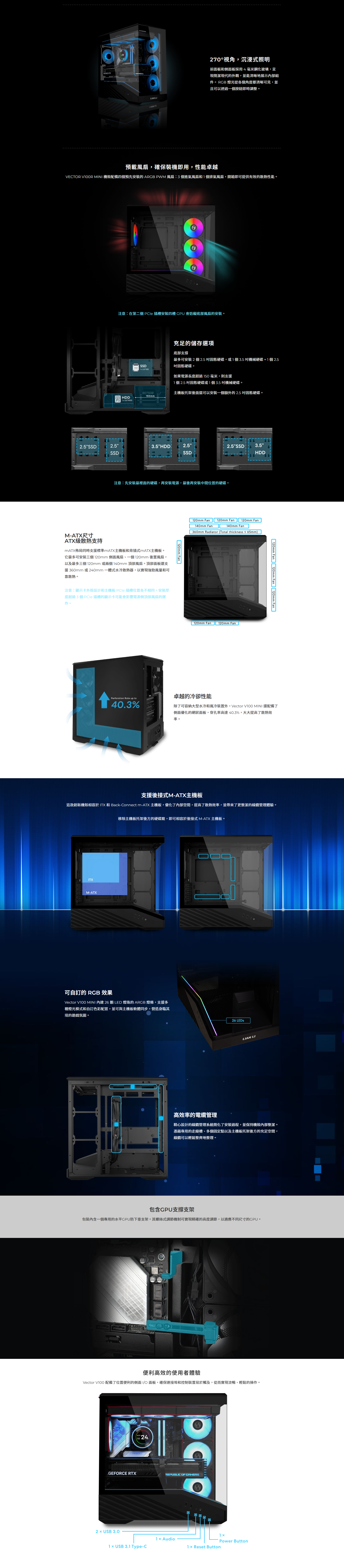 聯力 Vector V100R MINI 黑色 顯卡長41.5/U高16.3/全景玻璃/內建燈條,顯卡支架/背插/M-ATX