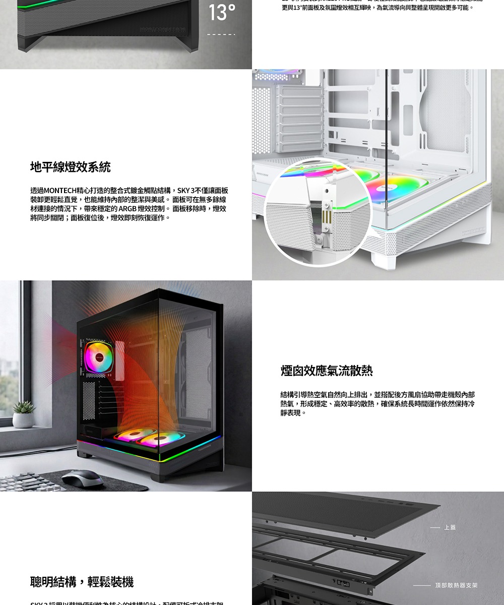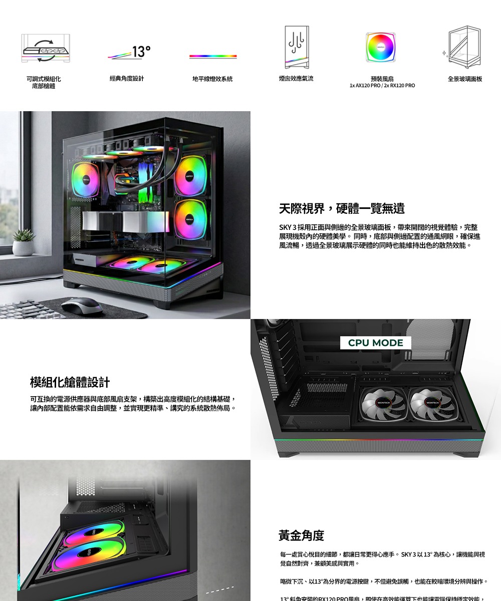 Montech SKY 3 黑 顯卡長44.5/CPU高18.5/全景玻璃透側/模組化可調底艙/支援背插/ATX