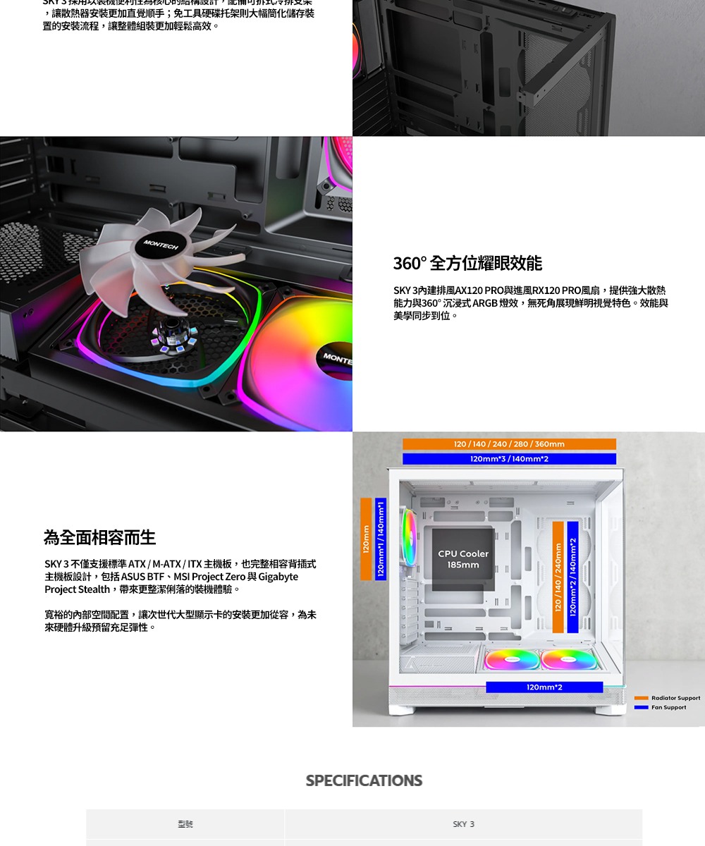 經典進化,引領下一個世代!承襲 SKY TWO 的設計血統,SKY 3 以可更換式底艙結構與觸點燈效系統,開創機殼的新標準。SKY 3也為背插式主機板與 RTX 50 系列顯示卡最佳化,將未來擴充性、極致散熱效能與俐落的視覺美學完美融合,展現真正面向未來的旗艦風格。