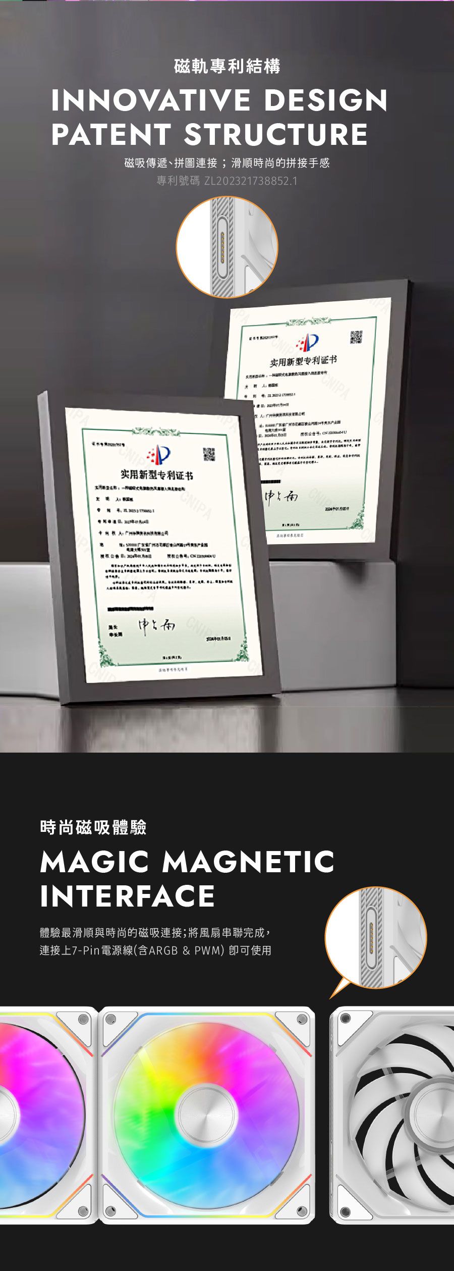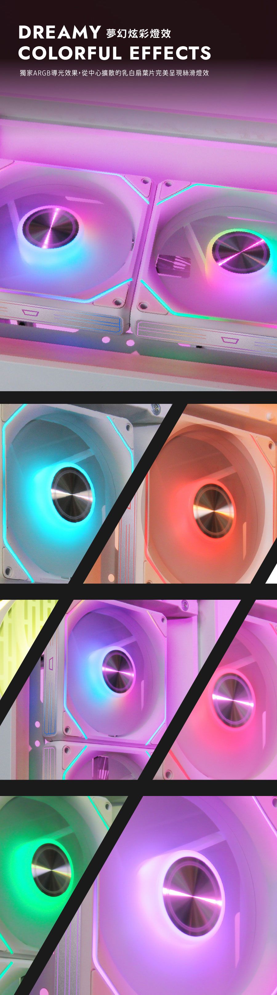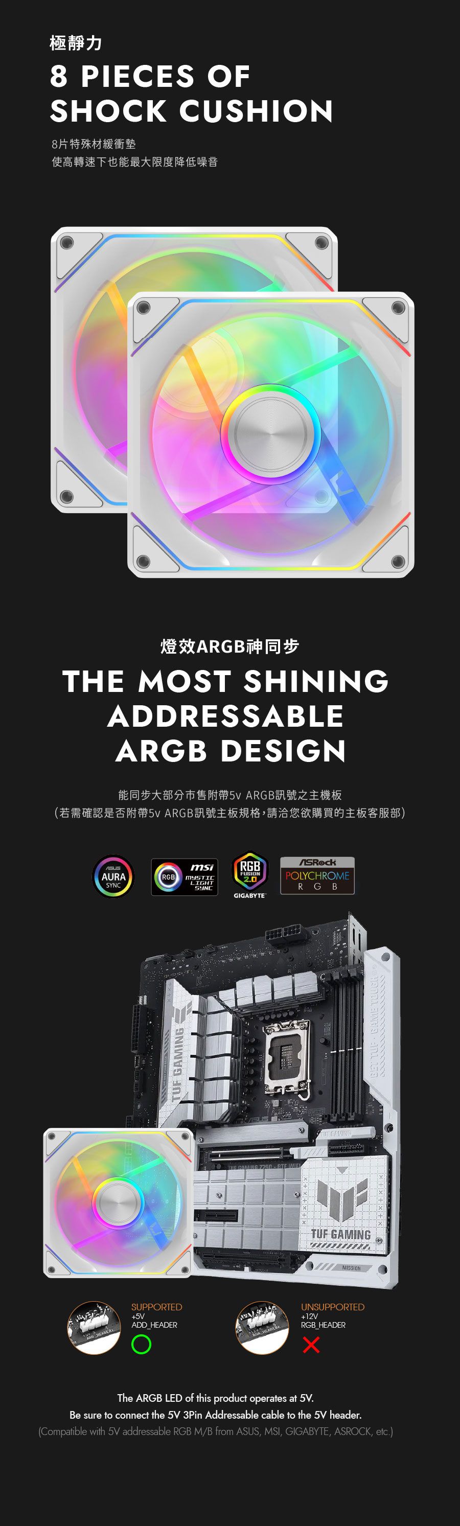 ✦ 特殊 ARGB 導光材質完美呈現絲滑燈效✦ 風扇之間透過磁吸拼接,提供極致的安裝體驗✦ 完美流體力學九彎扇葉設計,為散熱而生✦ 低噪音 Hydro 軸承風扇,使用壽命高達 40000 小時✦ PWM 智慧溫控系統,隨溫度自動調節✦ 8片特殊緩衝墊片,有效降低風扇運轉噪音