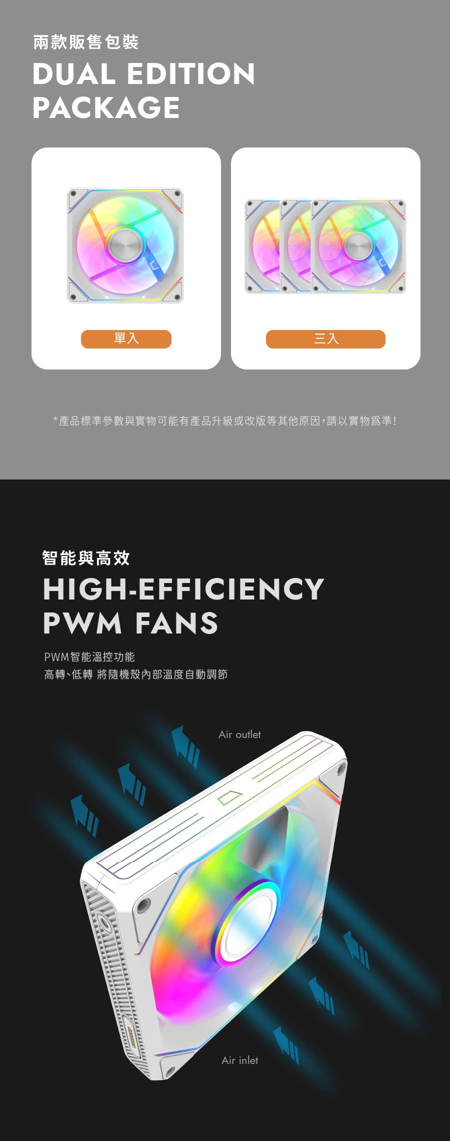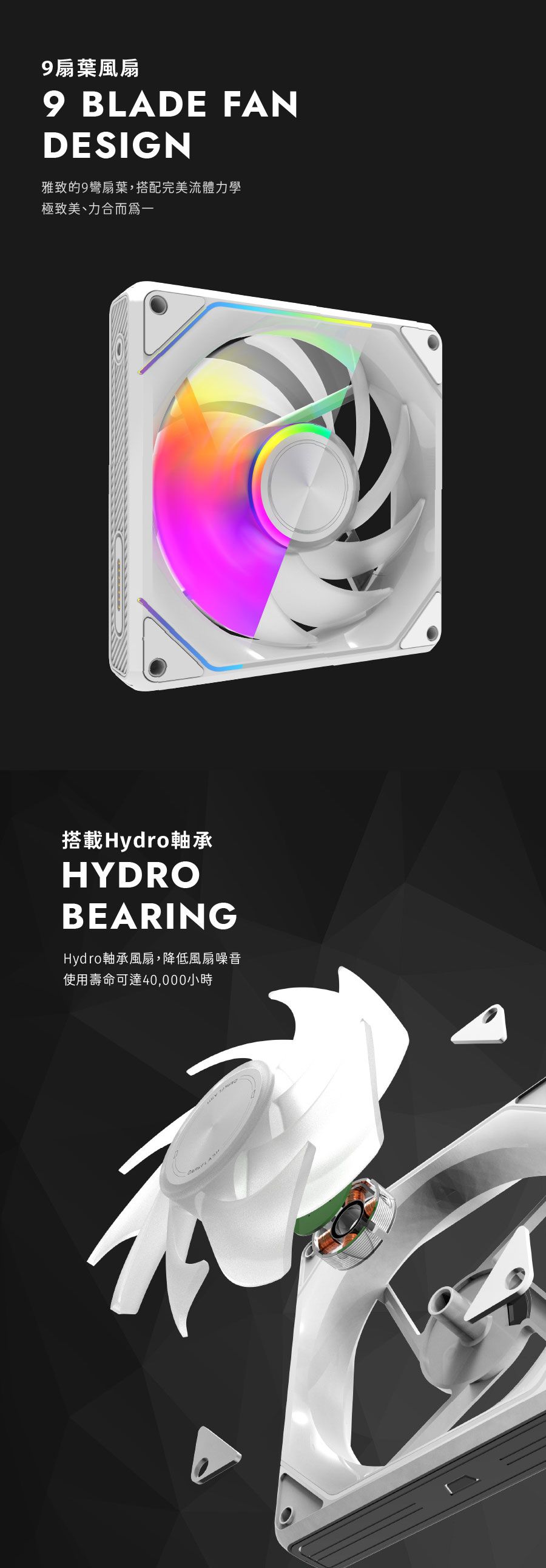 ✦ 特殊 ARGB 導光材質完美呈現絲滑燈效✦ 風扇之間透過磁吸拼接,提供極致的安裝體驗✦ 完美流體力學九彎扇葉設計,為散熱而生✦ 低噪音 Hydro 軸承風扇,使用壽命高達 40000 小時✦ PWM 智慧溫控系統,隨溫度自動調節✦ 8片特殊緩衝墊片,有效降低風扇運轉噪音