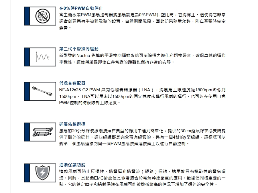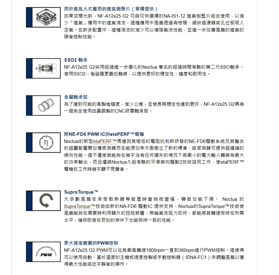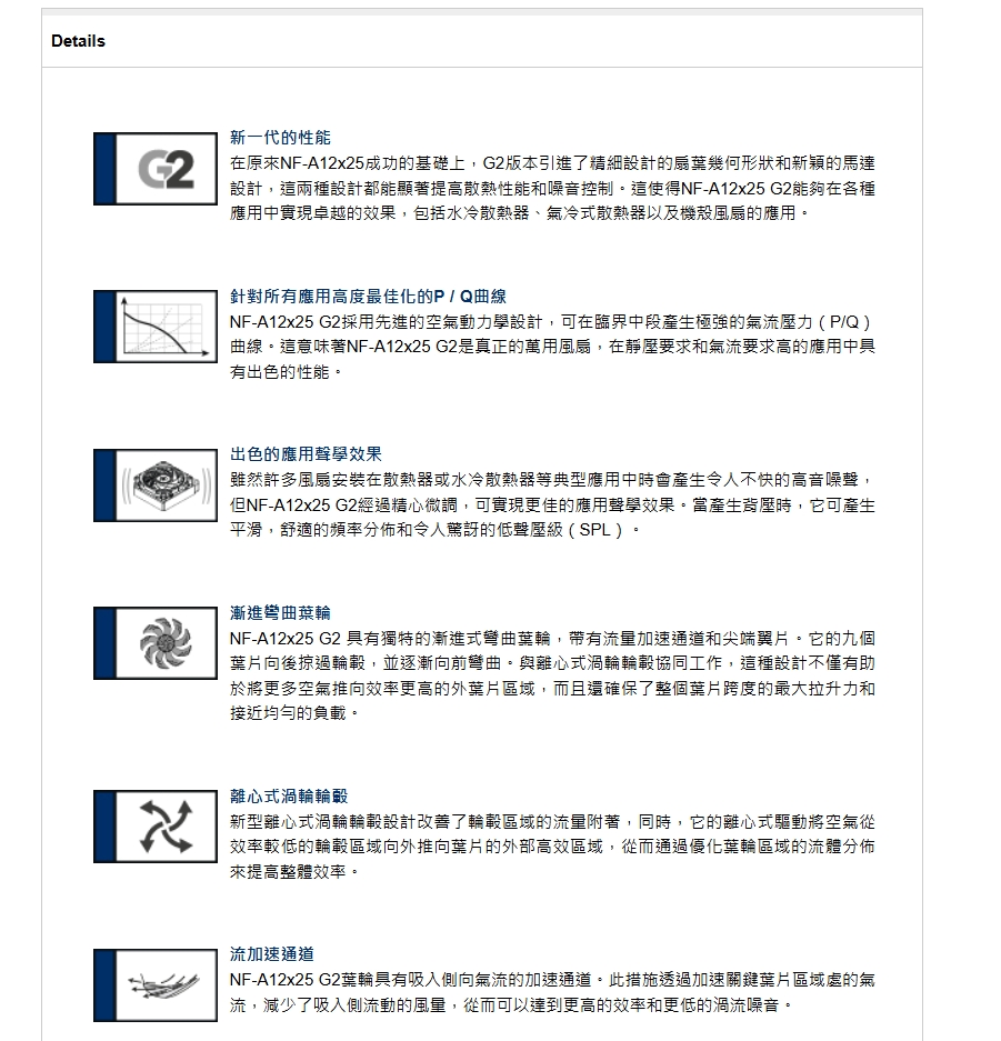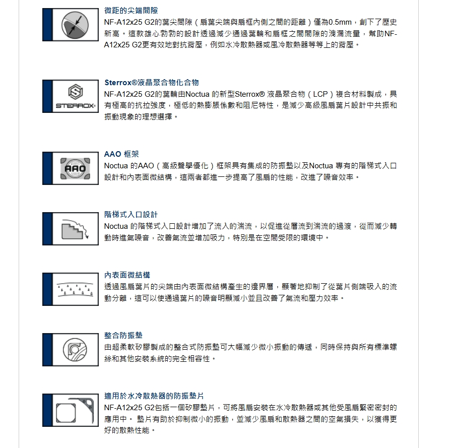 NF-A12x25 G2是基於屢獲殊榮的140mm NF-A14x25 G2的性能創意設計型號的NF-A12x25 120mm風扇的第二代、是進一步改進的繼任者:與前身和140mm版本一樣,NF-A12x25 G2是一款真正的全能型產品,無論是在低阻抗、氣流導向的應用(如機箱散熱)還是高阻抗、風壓要求高的場景(如風冷散熱器和水冷散熱器)中,都能在各種情況下產生出色的效果。