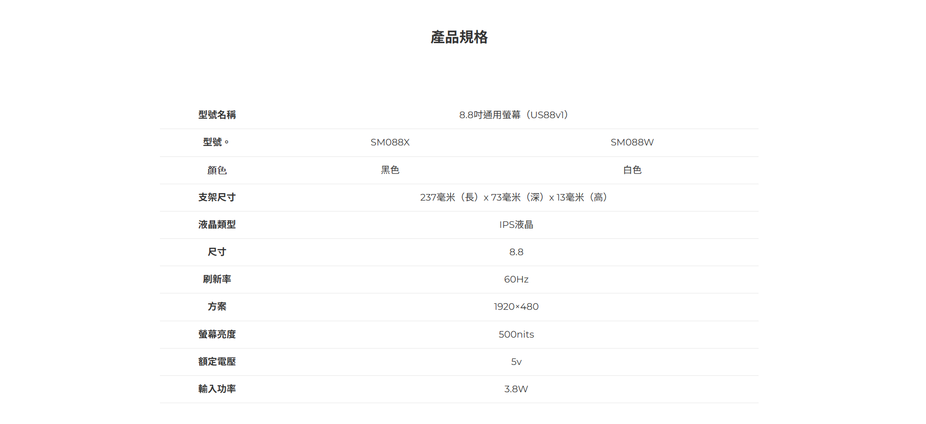 ✦ 8.8吋IPS LCD,1920×480,60Hz,500尼特