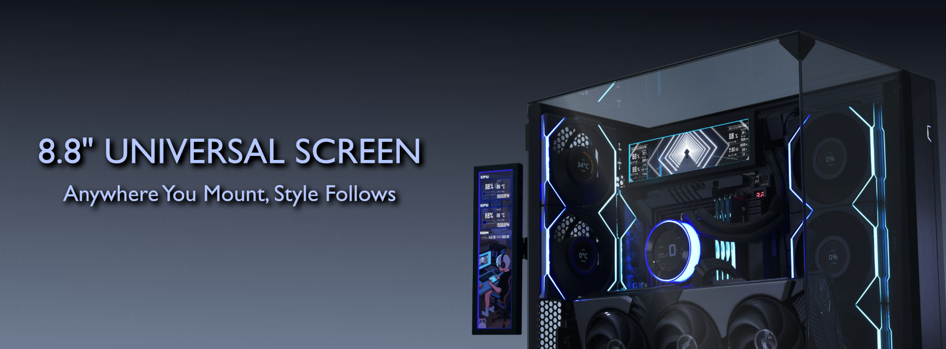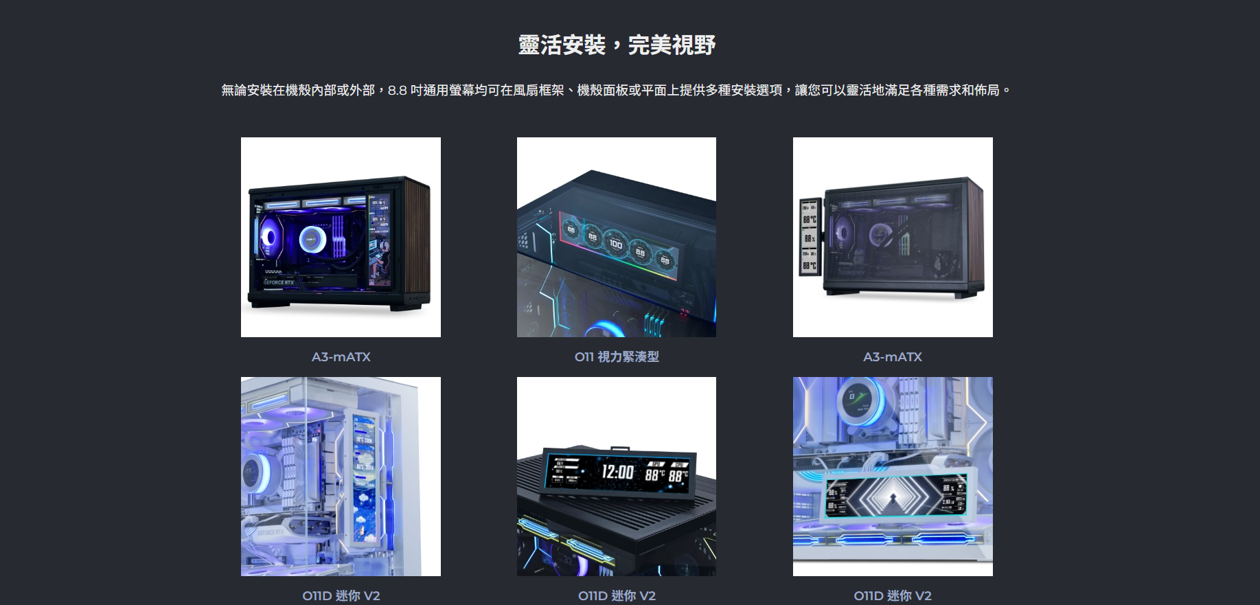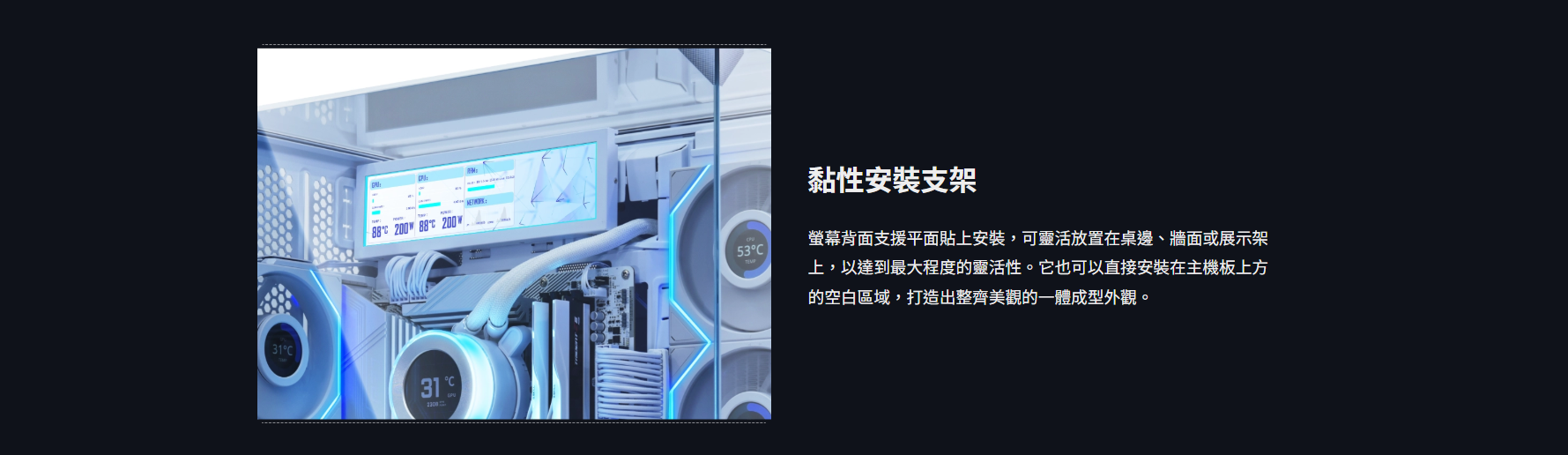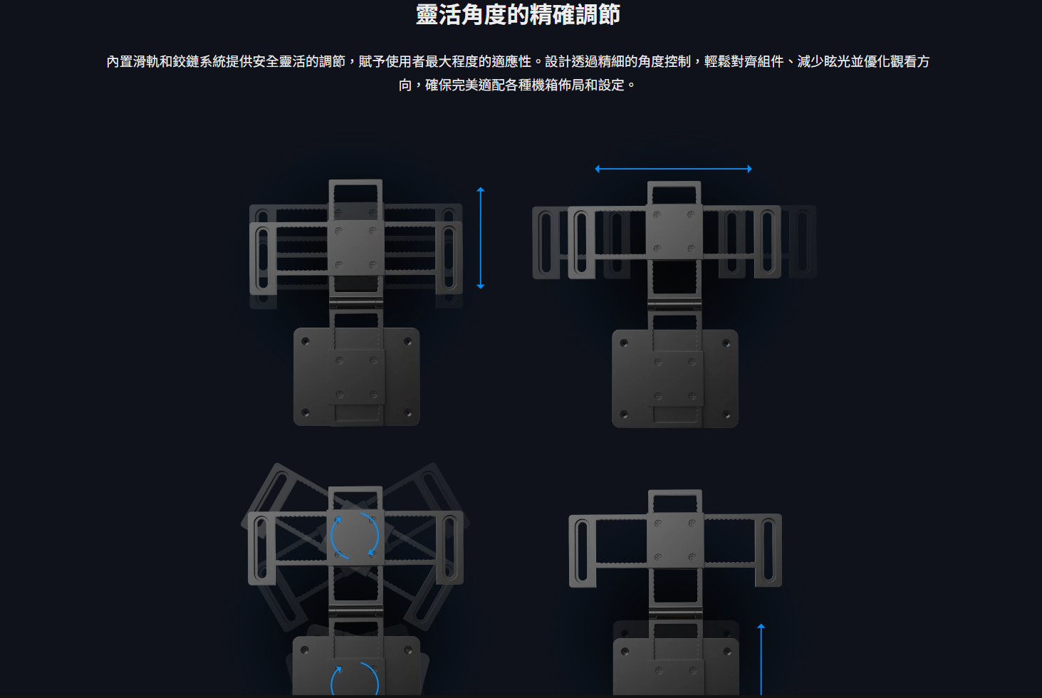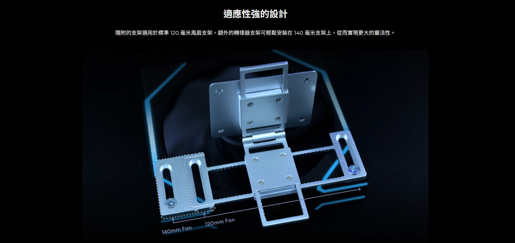 ✦ 多種安裝選項:120/140mm 風扇支架、黏合劑、帶角度調節的滑動導軌