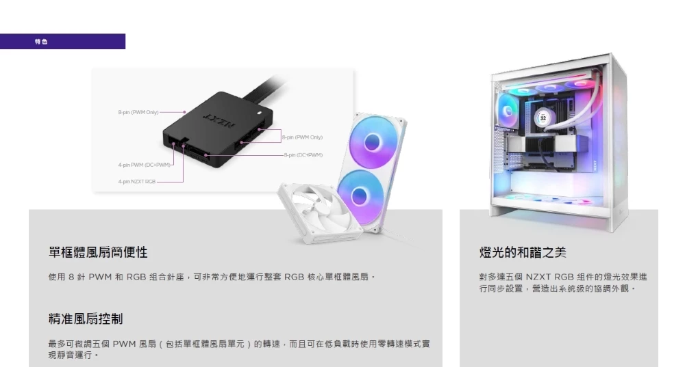 ✦ 對多達五個 NZXT RGB 組件的燈光效果進行同步設置,營造出系統級的協調外觀