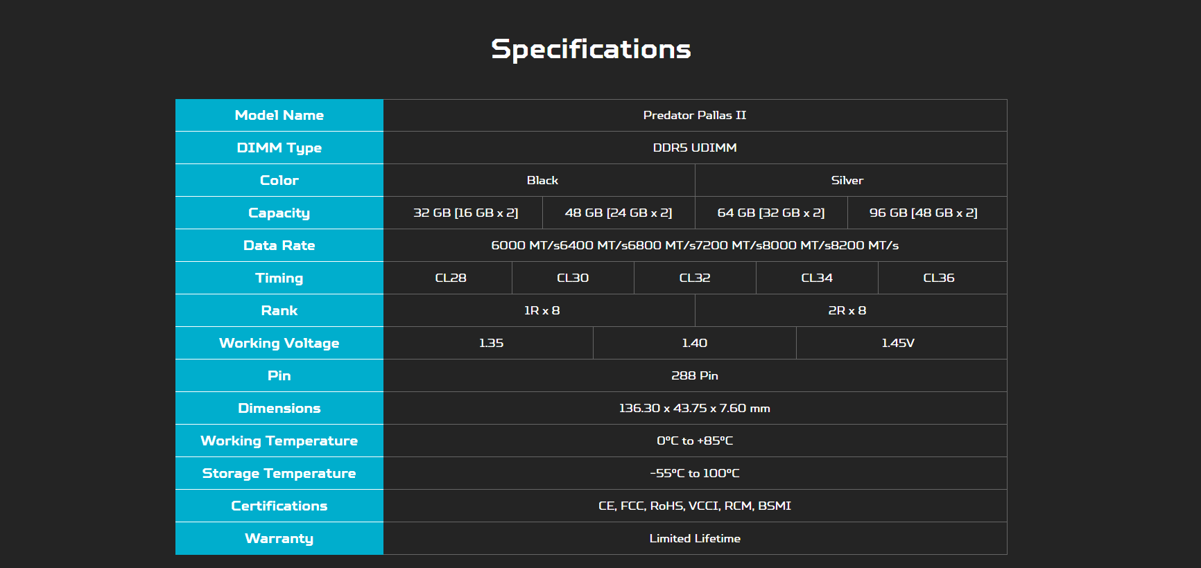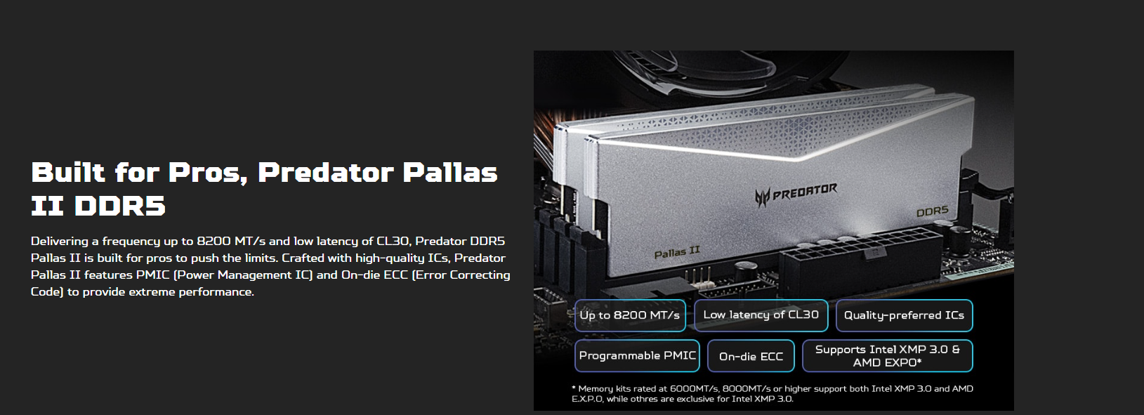 宏碁 Acer Predator Pallas II 96GB(雙通48GB*2) DDR5 6000 黑/CL28