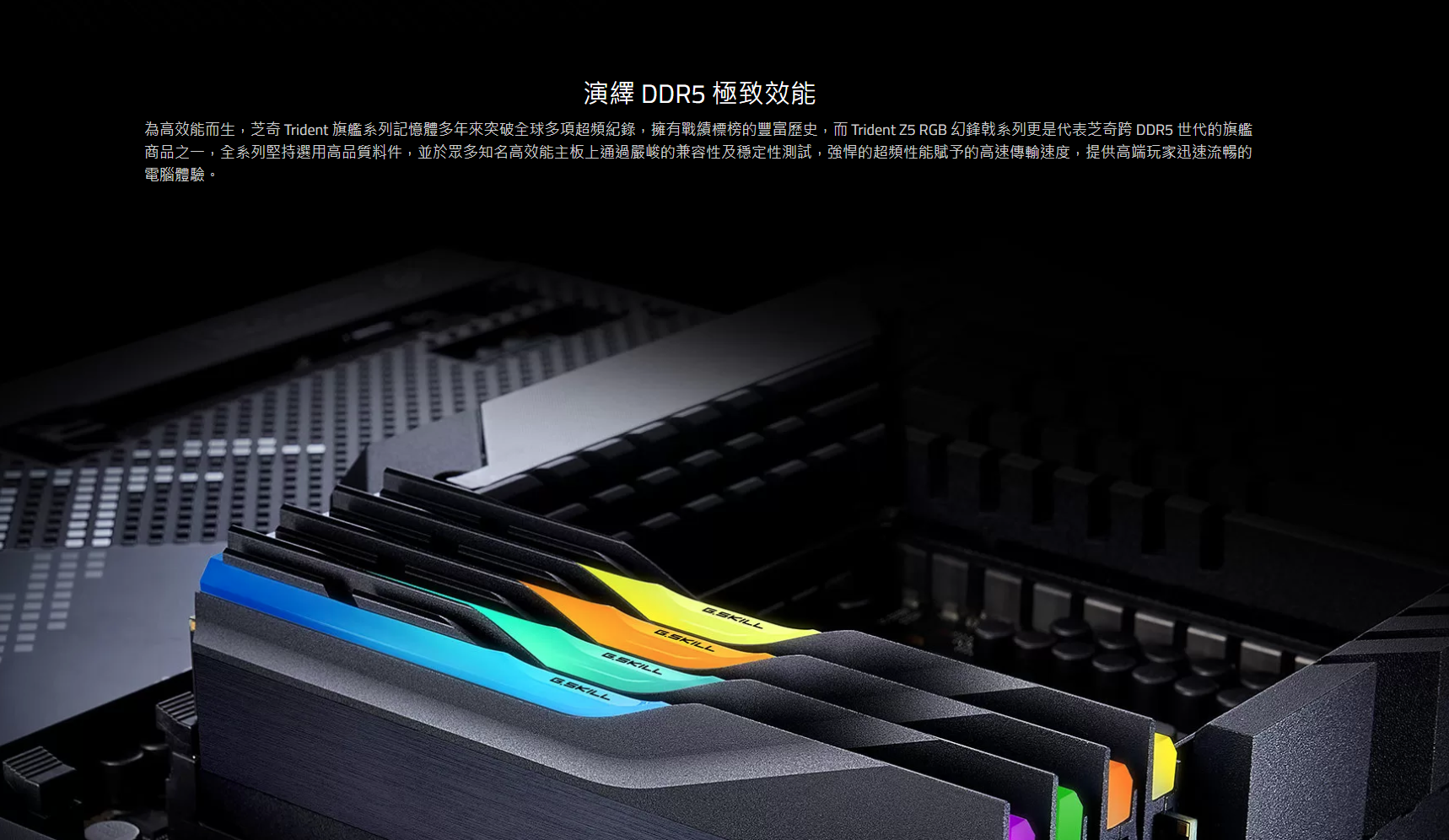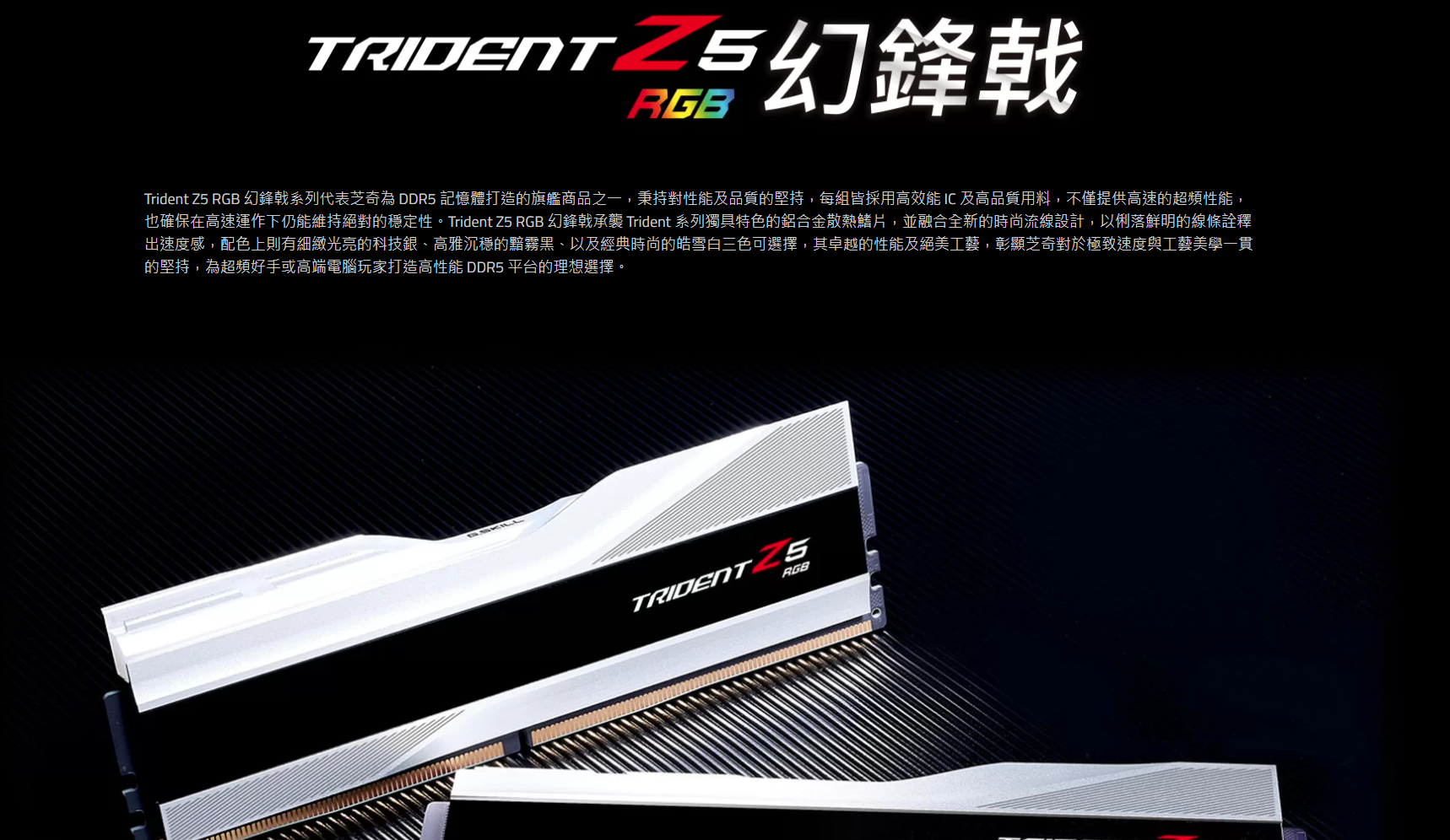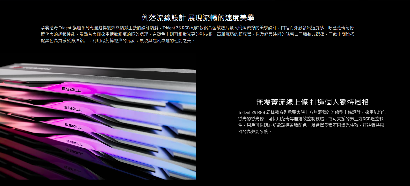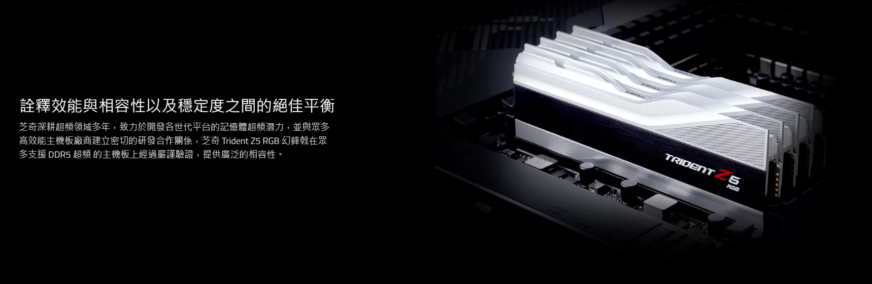 Trident Z5 RGB 幻鋒戟系列代表芝奇為 DDR5 記憶體打造的旗艦商品之一,秉持對性能及品質的堅持,每組皆採用高效能 IC 及高品質用料,不僅提供高速的超頻性能,也確保在高速運作下仍能維持絕對的穩定性。Trident Z5 RGB 幻鋒戟承襲 Trident 系列獨具特色的鋁合金散熱鰭片,並融合全新的時尚流線設計,以俐落鮮明的線條詮釋出速度感,配色上則有細緻光亮的科技銀、高雅沉穩的黯霧黑、以及經典時尚的皓雪白三色可選擇,其卓越的性能及絕美工藝,彰顯芝奇對於極致速度與工藝美學一貫的堅持,為超頻好手或高端電腦玩家打造高性能 DDR5 平台的理想選擇。