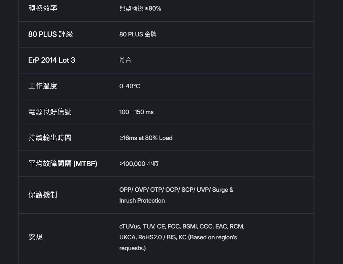 ✦ 支援 ATX 3.1 及耐用的 12V-2X6 電纜✦ 80 Plus 金牌認證效率✦ 靜音風扇性能,具備零轉速模式✦ 獨立的散熱技術✦ 全模組化線材✦ 10 年保固