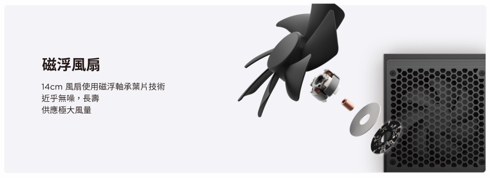 ✦ 140mm 銅軸磁浮風扇,藉由氣浮技術減少摩擦,大幅延長壽命,並且靜音