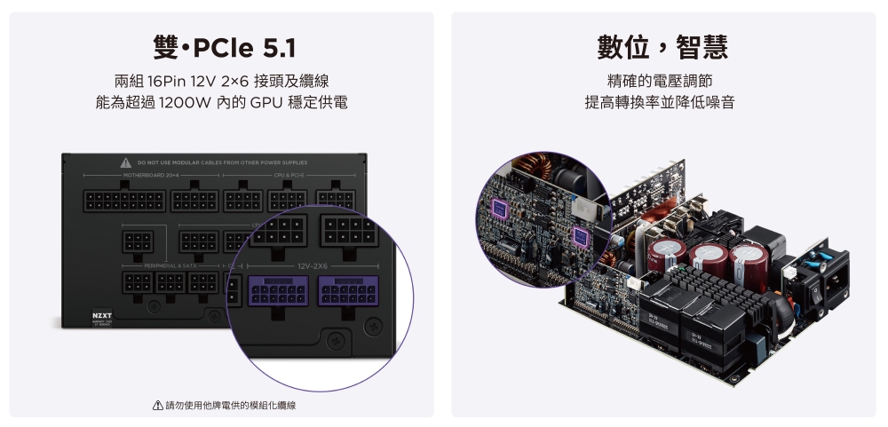 ✦ 配備雙16-pin 12V-2x6(H++)接頭,專為次世代顯示卡設計,1200W 電力需求輕鬆拿捏