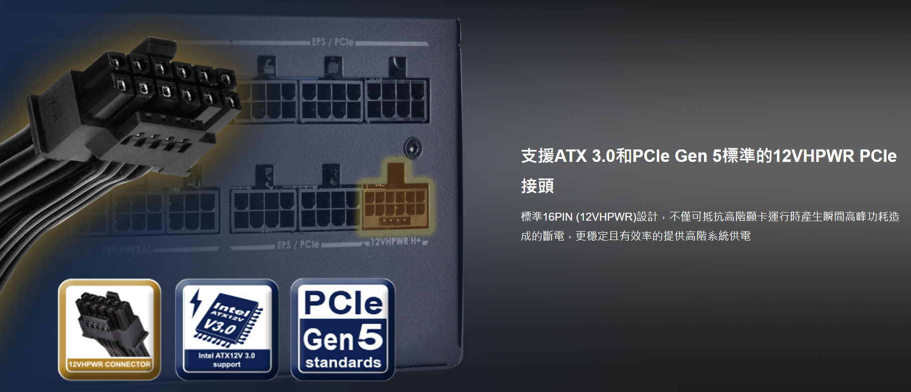 ✦ 支援ATX 3.0和PCIe Gen 5標準的12VHPWR PCIe接頭