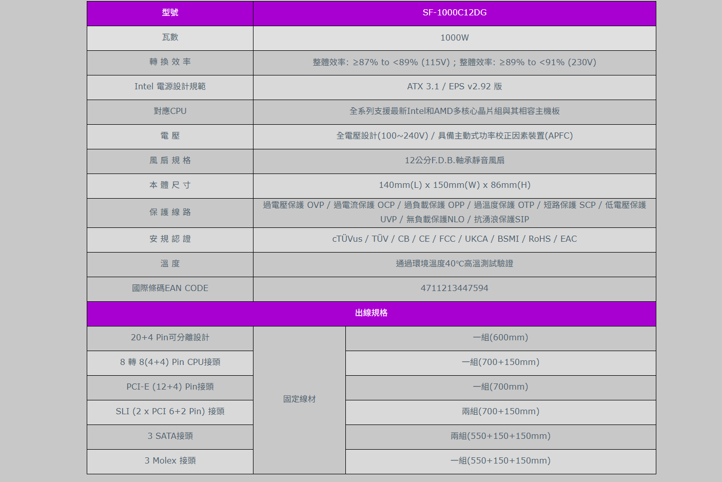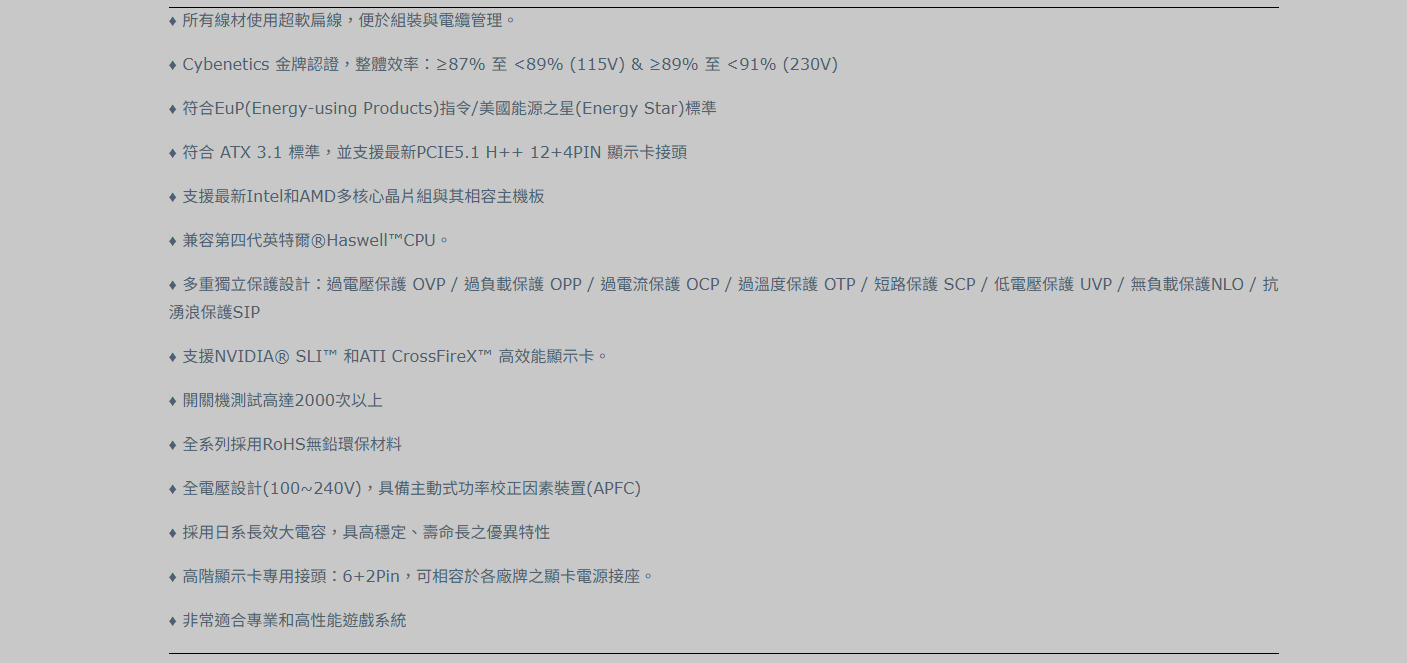 COMBAT DG 系列以高效能與穩定性為設計核心,通過 CYBENETICS Gold 認證 並符合 ATX 3.1 標準,專為電競與專業應用打造。採用 日系長效大電容、超靜音 F.D.B. 風扇 以及 超柔性扁平排線設計,兼具耐用性、靜音散熱與整線美觀。支援 200% 瞬間功率輸出,為新世代 CPU 與 GPU 提供卓越穩定的電力支援。