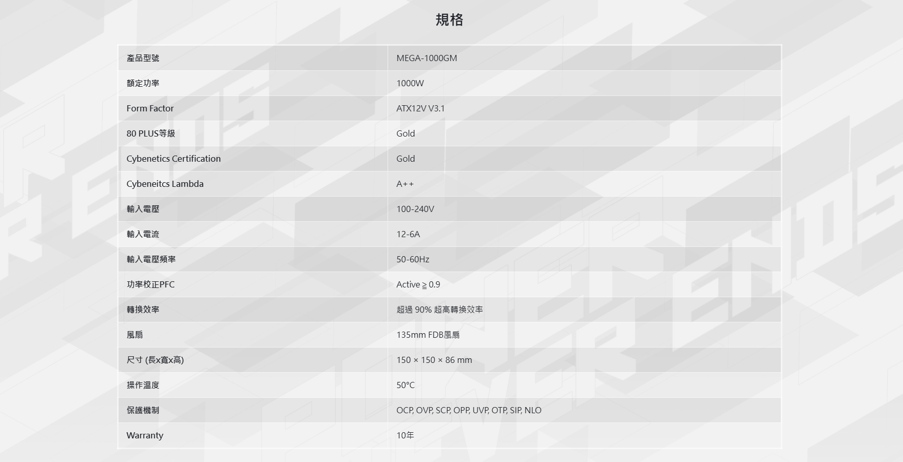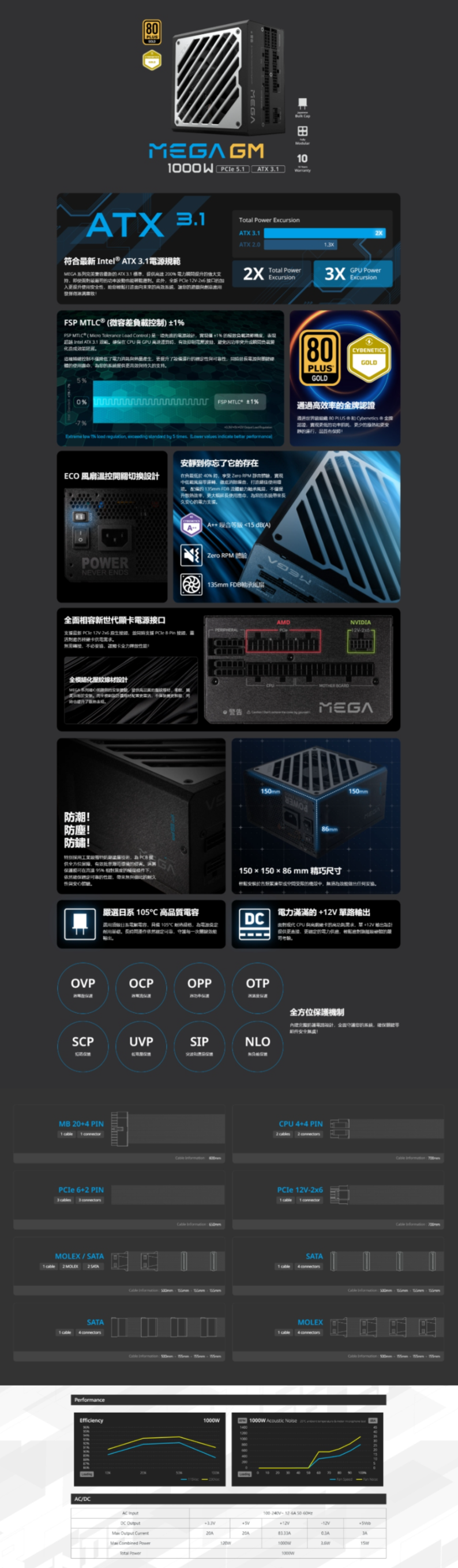 全漢 MEGA GM 1000W(MIT) 雙8/金牌/全模/ATX3.1(PCIe 5.1)/全日系/防潮塗層/10年保