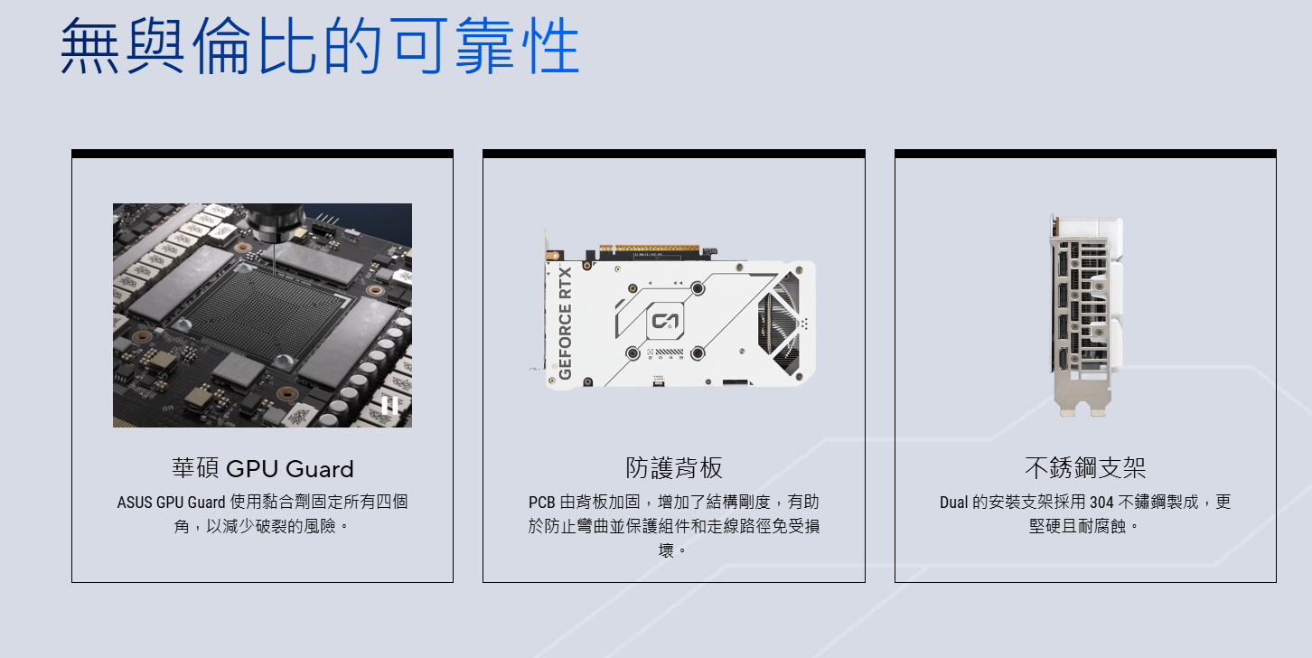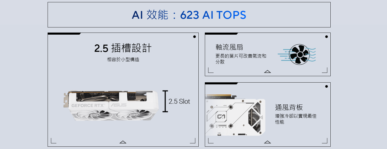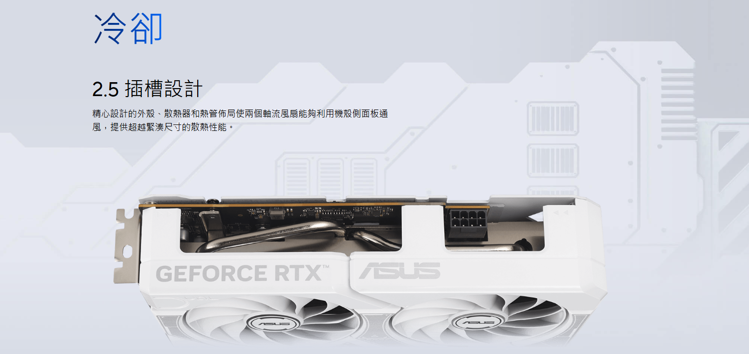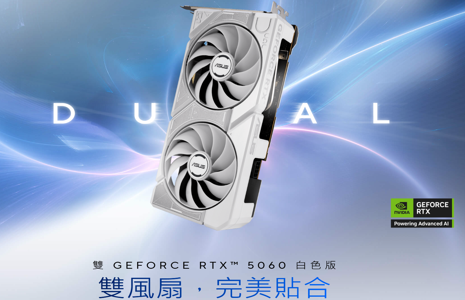 ASUS Dual GeForce RTX™ 5060 白色版顯示卡兼具強大的散熱性能和廣泛的兼容性。它搭載來自旗艦顯示卡的先進散熱解決方案,包括兩個軸流風扇,可優化散熱器的氣流。採用緊湊的 2.5 插槽設計,在更小的空間內提供更強大的效能。這些增強功能使華碩 Dual 成為追求緊湊型顯示卡效能的玩家的理想之選。