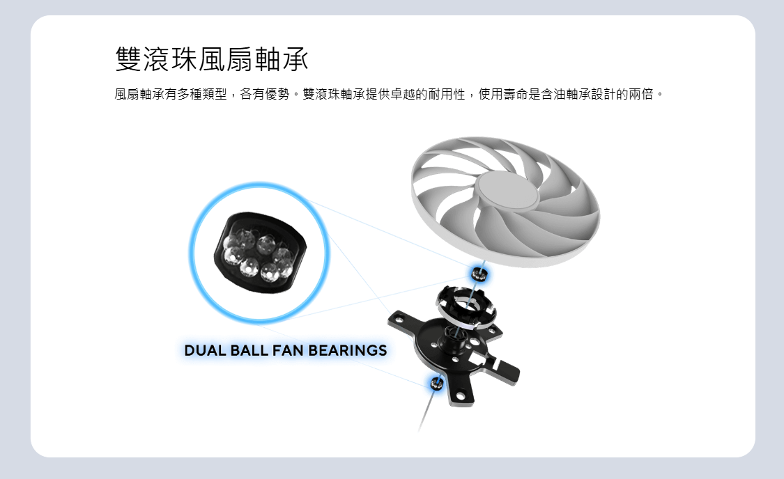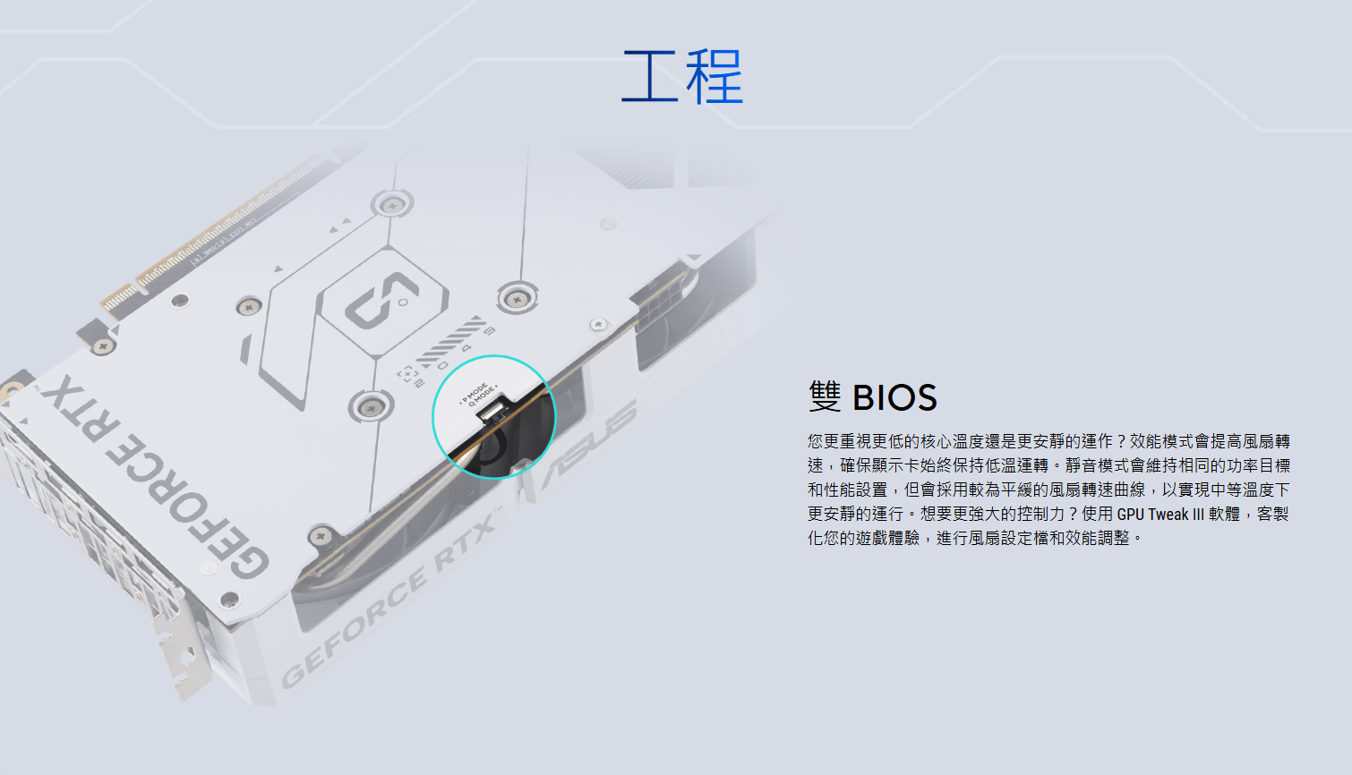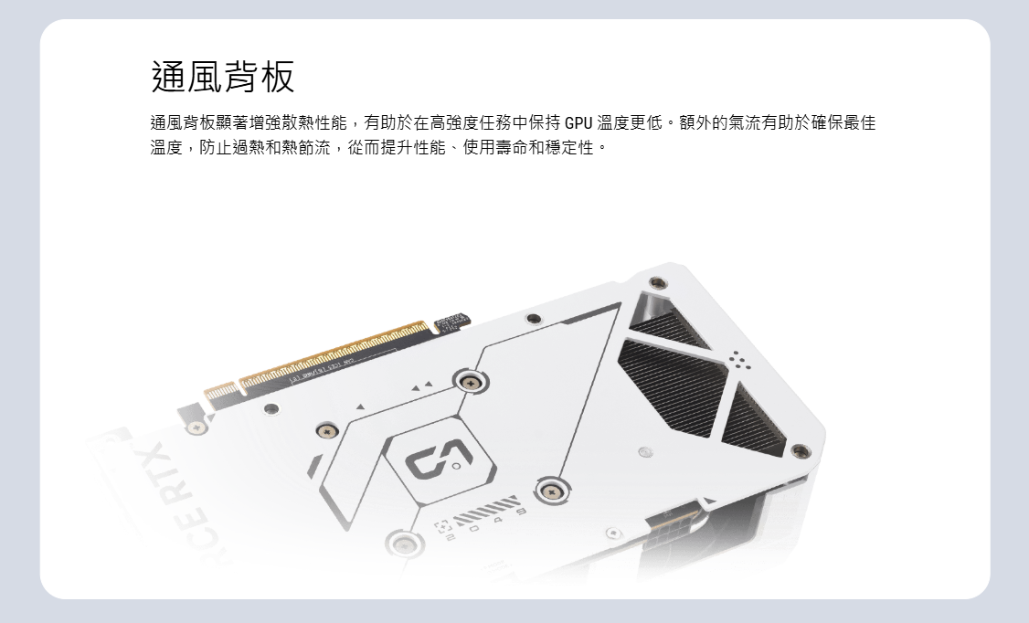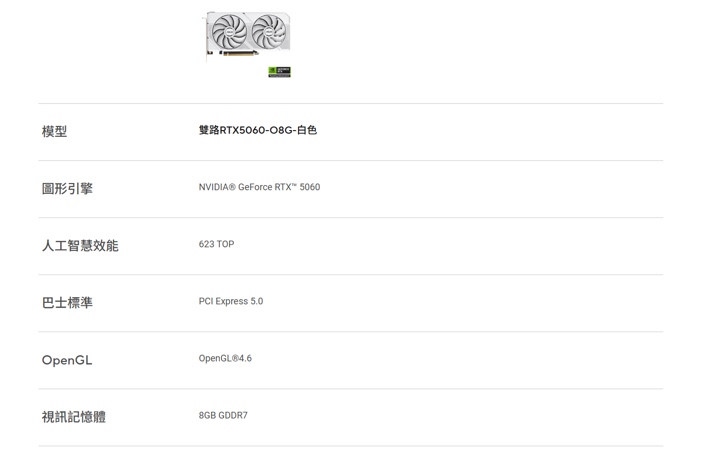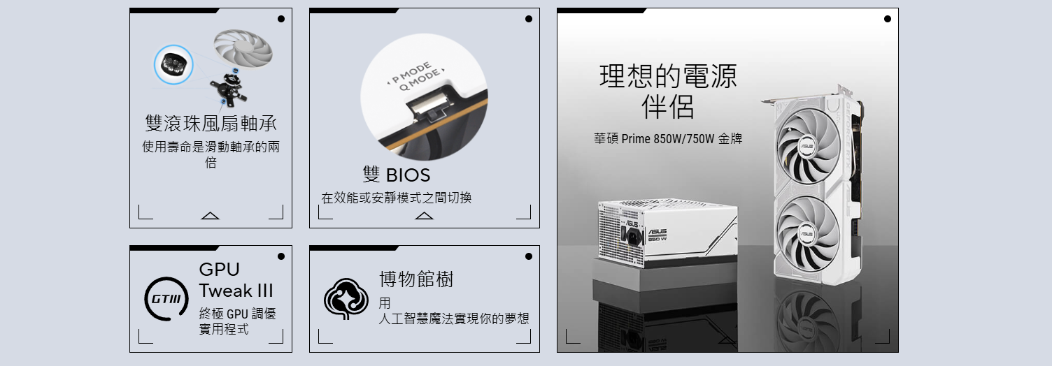 ASUS Dual GeForce RTX™ 5060 白色版顯示卡兼具強大的散熱性能和廣泛的兼容性。它搭載來自旗艦顯示卡的先進散熱解決方案,包括兩個軸流風扇,可優化散熱器的氣流。採用緊湊的 2.5 插槽設計,在更小的空間內提供更強大的效能。這些增強功能使華碩 Dual 成為追求緊湊型顯示卡效能的玩家的理想之選。